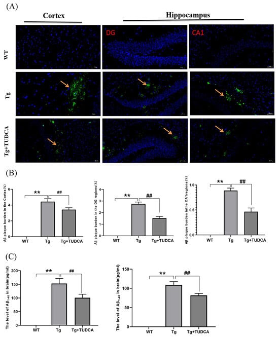 Amyloid deposition is indicated by the presence of silvery yellow patches in Thioflavin-S staining. According to the findings, there was an increase in the silvery yellow patches in the Tg mice, whereas a decrease was observed in the TUDCA-treated mice (p < 0.01, Figure 2A,B). The concentrations of Aβ1-42 and Aβ1-40 in the brain tissues of Tg mice showed a significant increase, whereas the levels in the mice treated with TUDCA exhibited a significant decrease (p < 0.01, Figure 2C).