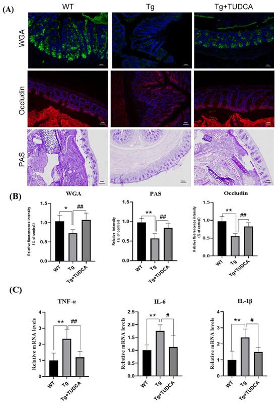 TUDCA enhanced the integrity of the intestinal barrier in mice. (A) Representative images of WGA (green), Occludin (red), and PAS (purple) staining; blue color represents DAPI, scale bar = 100 μm. (B) quantitative analysis of the staining. (C) qRT-PCR detected inflammatory cytokines in the colon tissue. Data are mean ± SEM. * p < 0.05, ** p < 0.01 vs. WT group, # p < 0.05, ## p < 0.01 vs. Tg group.