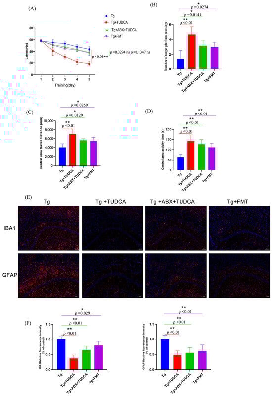 After the intervention, behavioral differences were analyzed, and the results were shown in Figure 7A–D. Firstly, the Morris water maze was used to detect the learning and memory ability of mice in spatial orientation. The data showed that during the orientation navigation experiment in the first 5 days, compared with the Tg group, the escape incubation period of mice in the Tg + ABX + TUDCA group and the Tg + FMT group showed a trend of gradual shortening, but there was no statistical difference. These results indicated that the escape latency of AD mice was improved in both groups, but the effect was not obvious. On the 6th day, the platform was removed for a spatial exploration experiment. The results showed that compared with the Tg group, mice in the Tg + ABX + TUDCA group and the Tg + FMT group had significantly increased the frequency of crossing the virtual platform, but there was no significant difference between the two groups. Then, we carried out the open field tests, and the results show that both the Tg + ABX + TUDCA group and the Tg + FMT group exhibited longer durations and distances of central area activity compared to AD mice, indicating that this anxious behavior was alleviated, but the overall behavioral performance was not as good as the Tg + TUDCA group. FMT experiments showed that TUDCA could improve the spatial orientation disorder and improve the learning and memory ability of AD mice by regulating intestinal flora; the experiment of pseudo-sterile mice treated with antibiotics suggests that TUDCA may improve memory and cognition without intestinal flora.