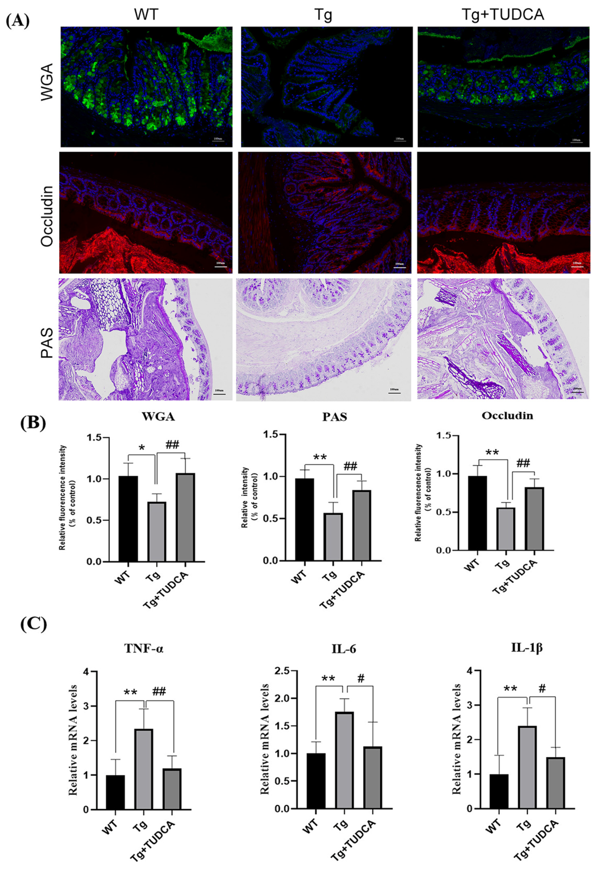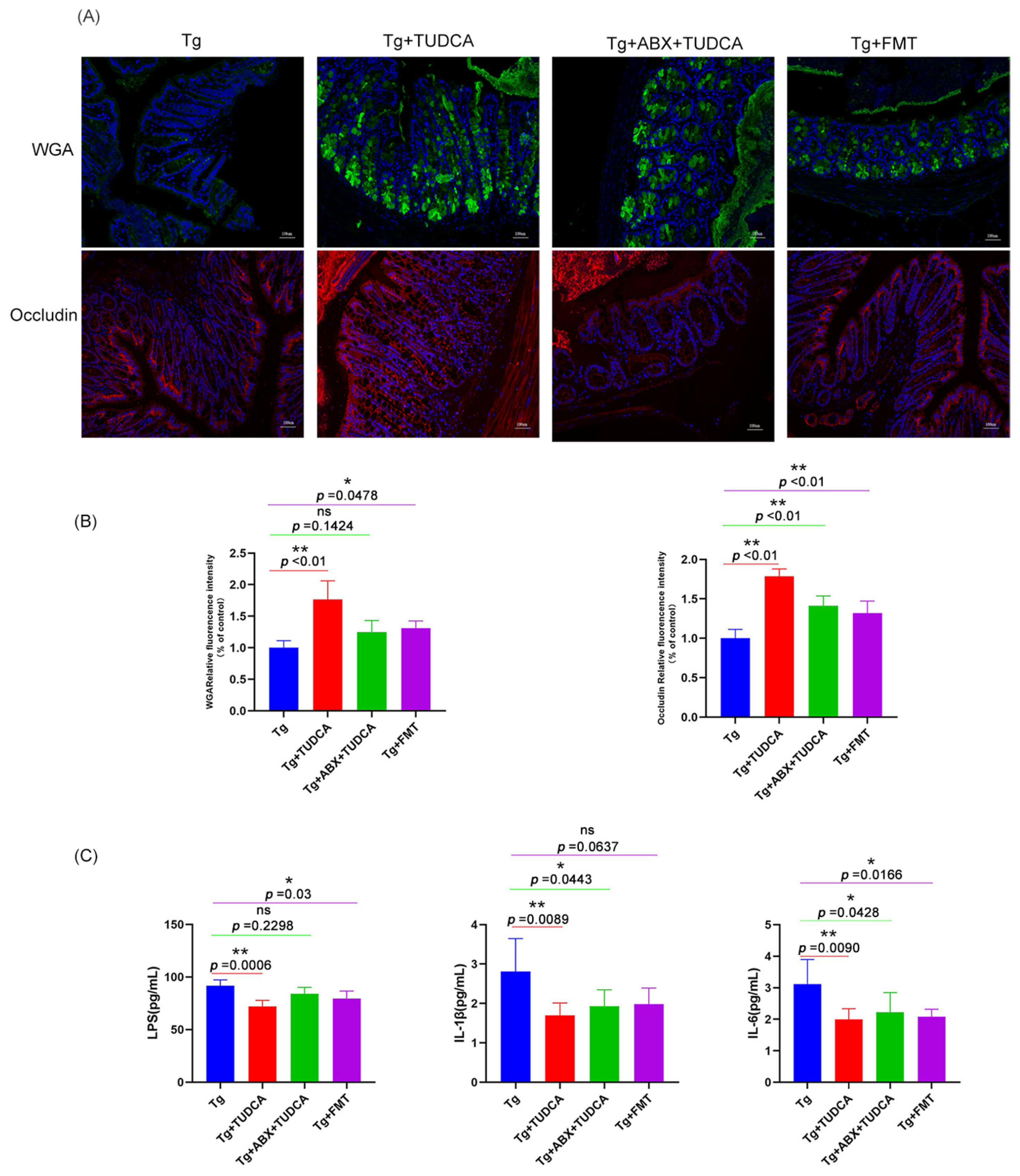 3.5. Effect of TUDCA on the Impairment of the Gut Barrier and Inflammation in APP/PS1 Mice