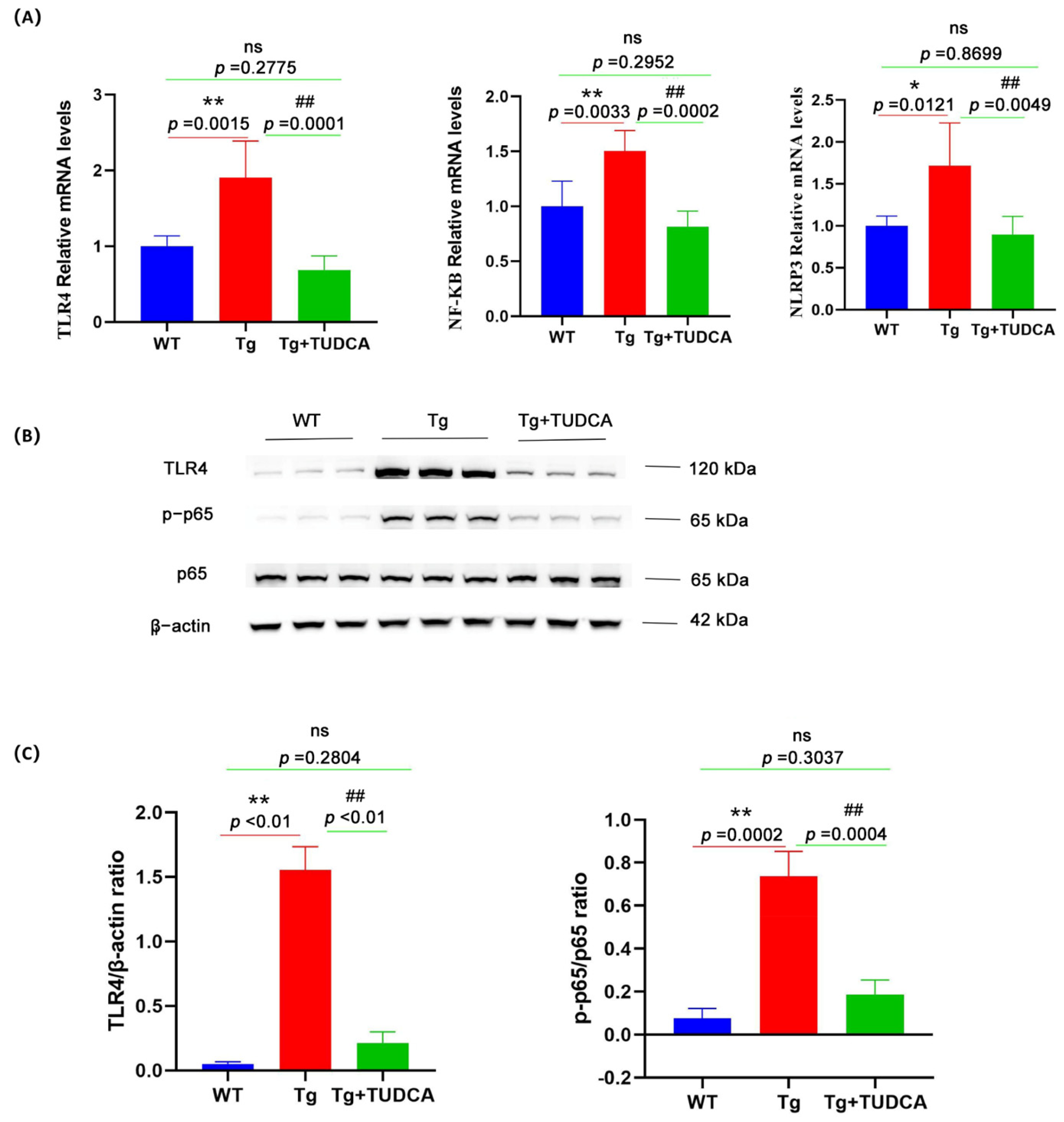 3.8. Effect of TUDCA on the TLR4/NF-κB/NLRP3 Pathway in APP/PS1 Mice