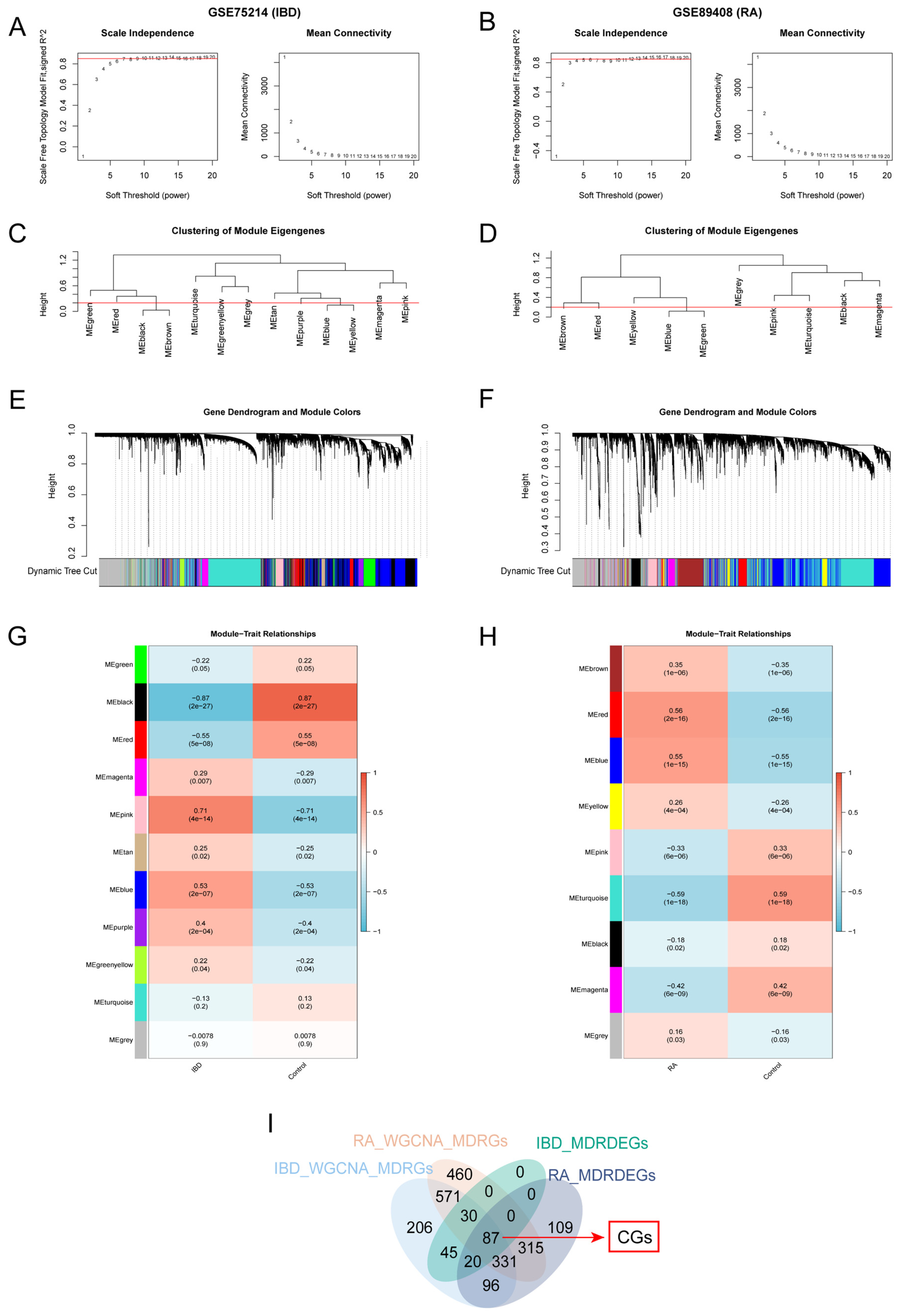 3.2. WGCNA and the Acquisition of CGs of IBD and RA