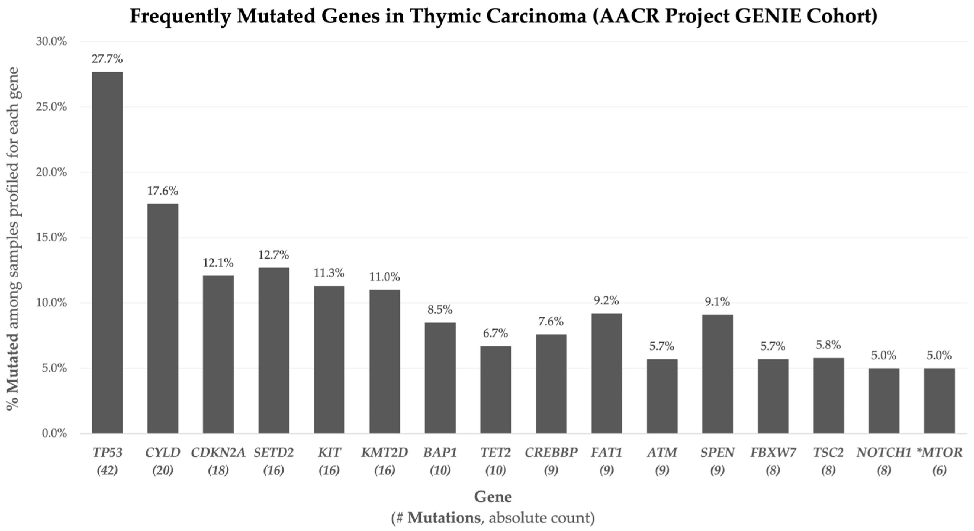 Chicago/Turabian StyleChudziak, Aden V., Tyson J. Morris, David Maliy, Grace S. Saglimbeni, Akaash Surendra, Beau Hsia, Huijun Li, and Abubakar Tauseef. 2026. "Genomic Landscape of Thymic Carcinoma: A Large-Scale Analysis of Somatic Mutations, Demographic Disparities, and Metastatic Drivers from the AACR Project GENIE® Cohort" Current Issues in Molecular Biology 48, no. 1: 90. https://doi.org/10.3390/cimb48010090