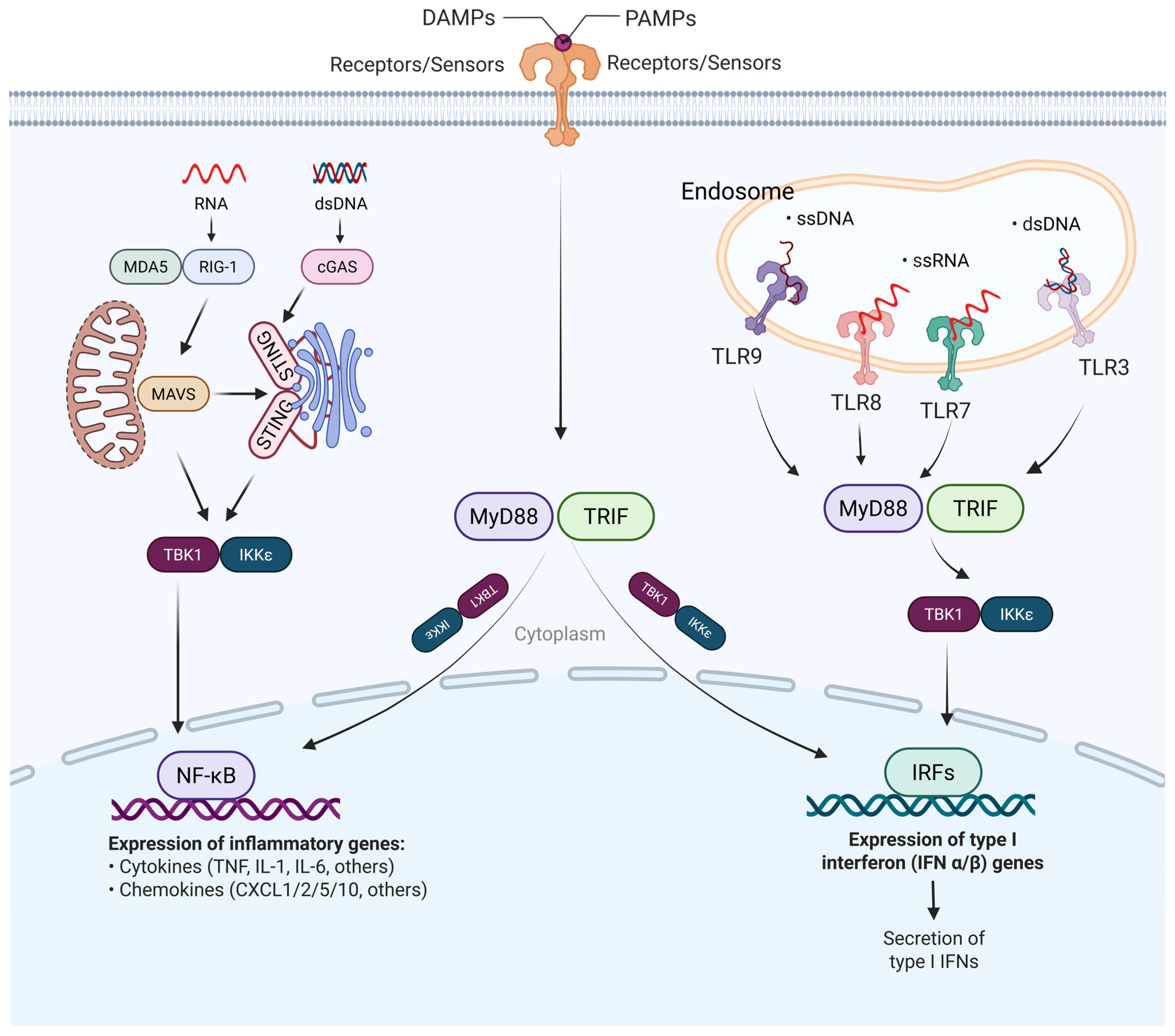 | DAMPs | Mitochondrial DNA | TLR9, NLRP3, cGAS-STING [81] | IRF3/IRF7 [29,51] |