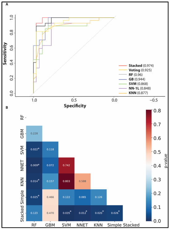 Discovery phase performance: ROC curves comparing the stacked ensemble (AUC = 0.97) with individual base classifiers and an averaging ensemble (A), with DeLong test p-values (i.e., significant: p-value < 0.05—denoted with *) annotated (B) (Voting and Simple are the same classifier).