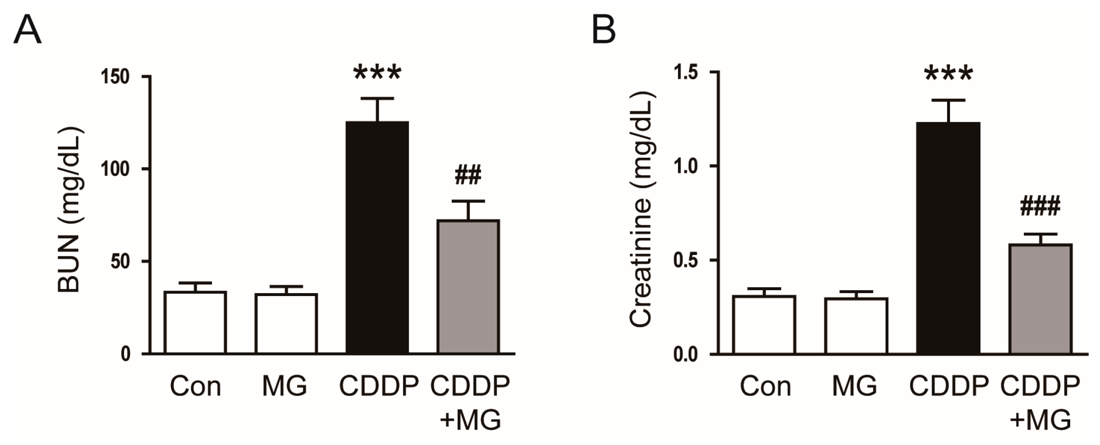 3.1. MG Attenuates CDDP-Induced Renal Dysfunction and Histological Abnormalities