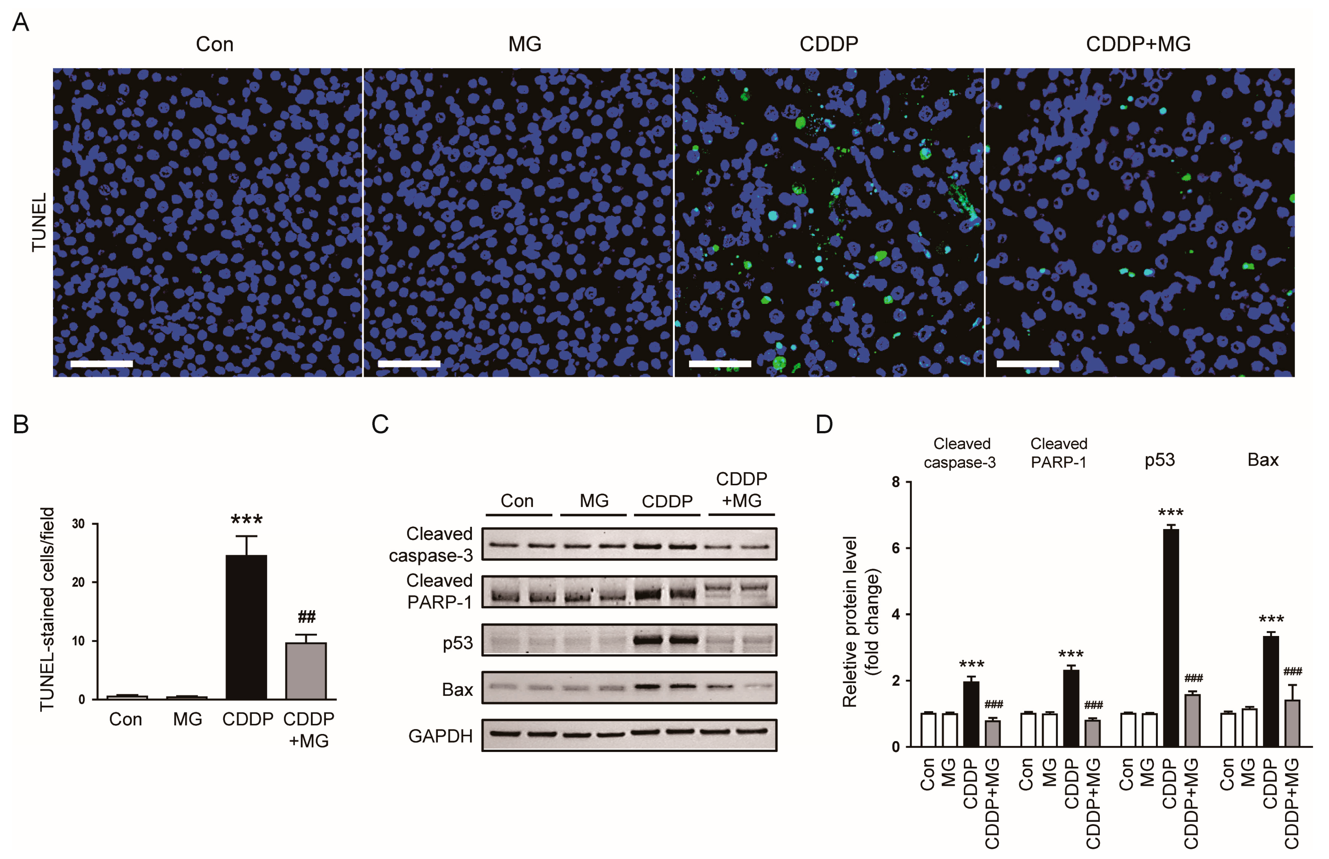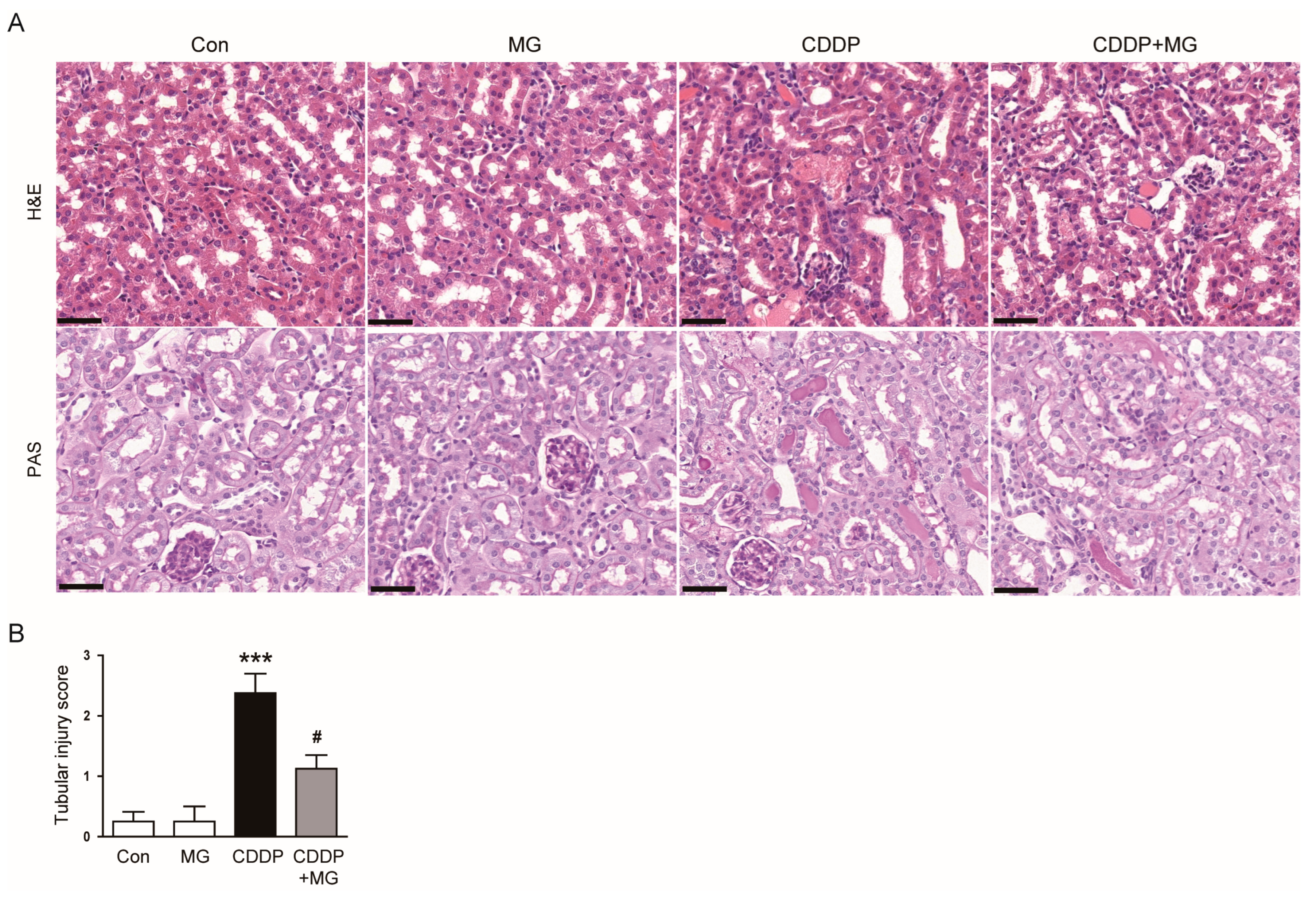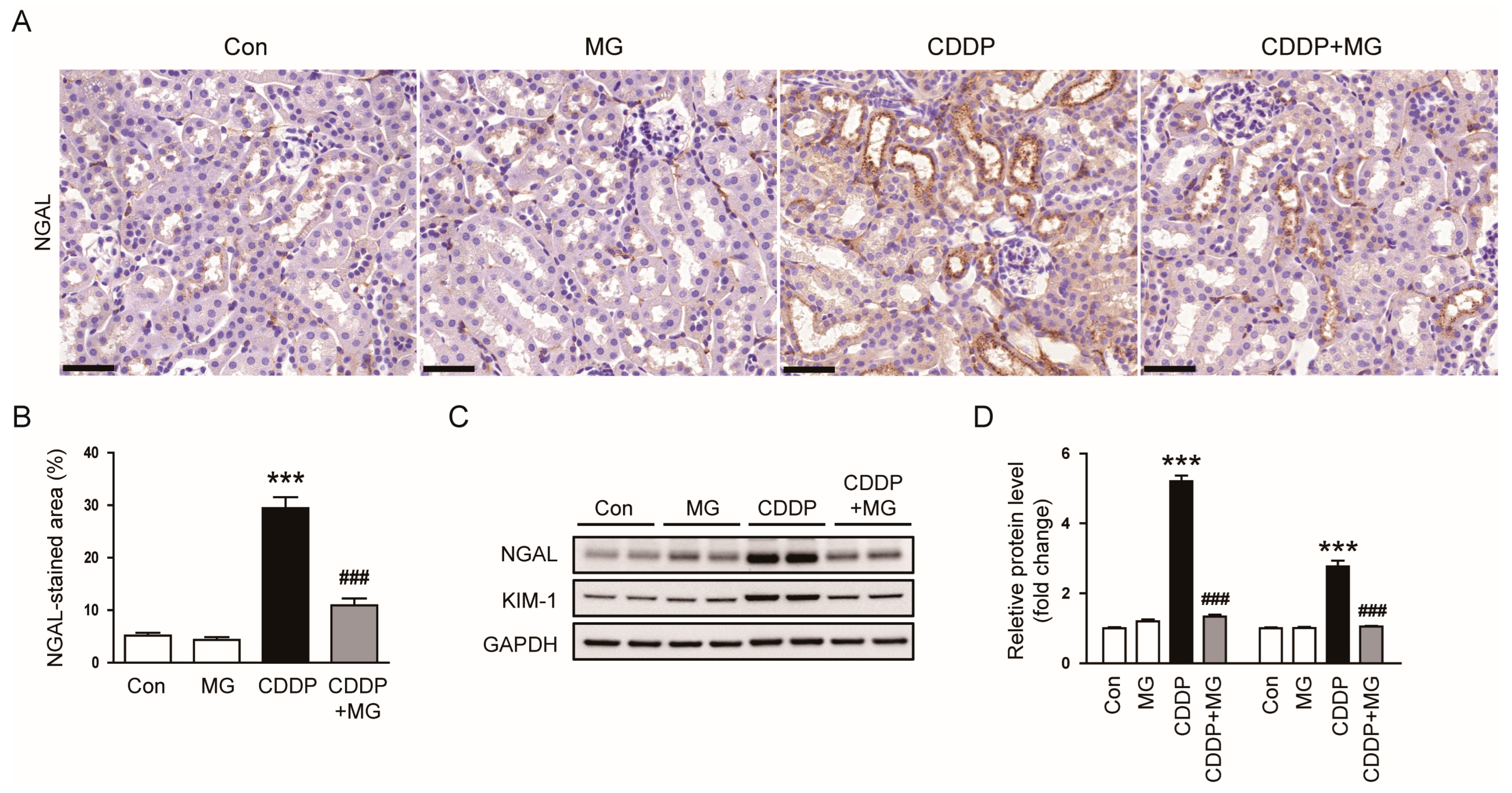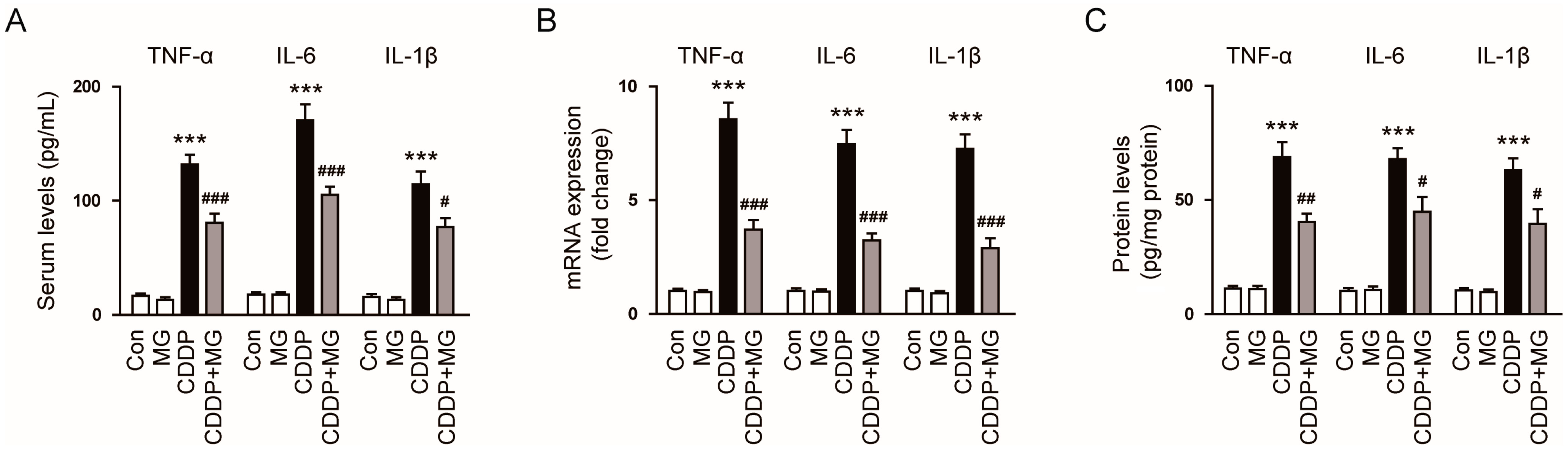 3.2. MG Reduces CDDP-Induced Inflammatory Responses
