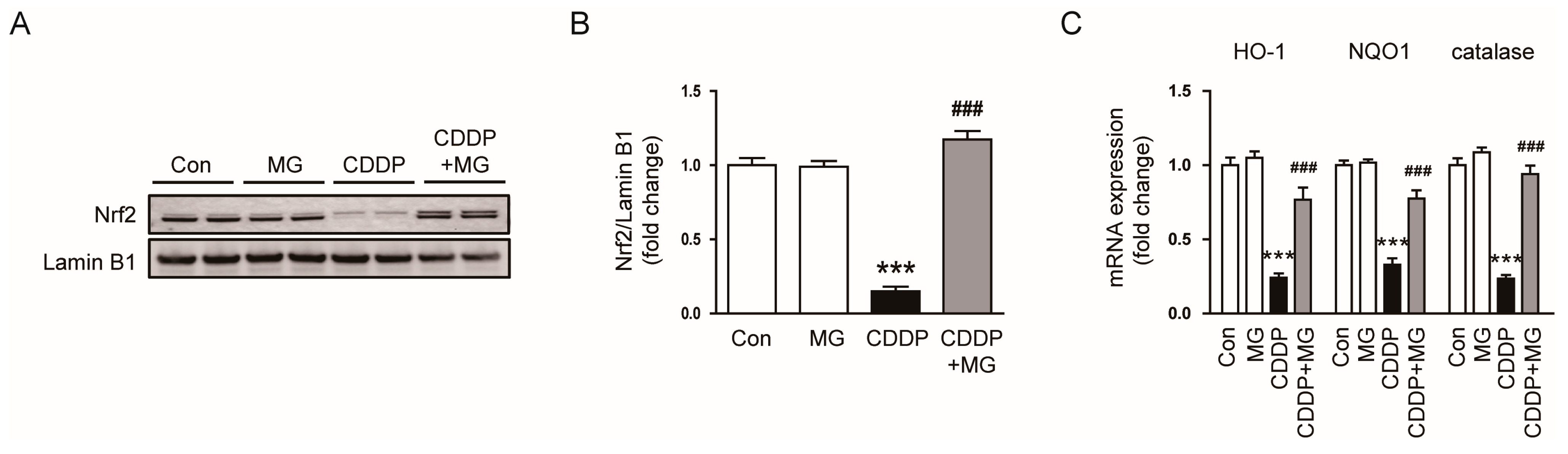 3.5. MG Restores CDDP-Suppressed Nrf2 Signaling Pathway in the Kidney