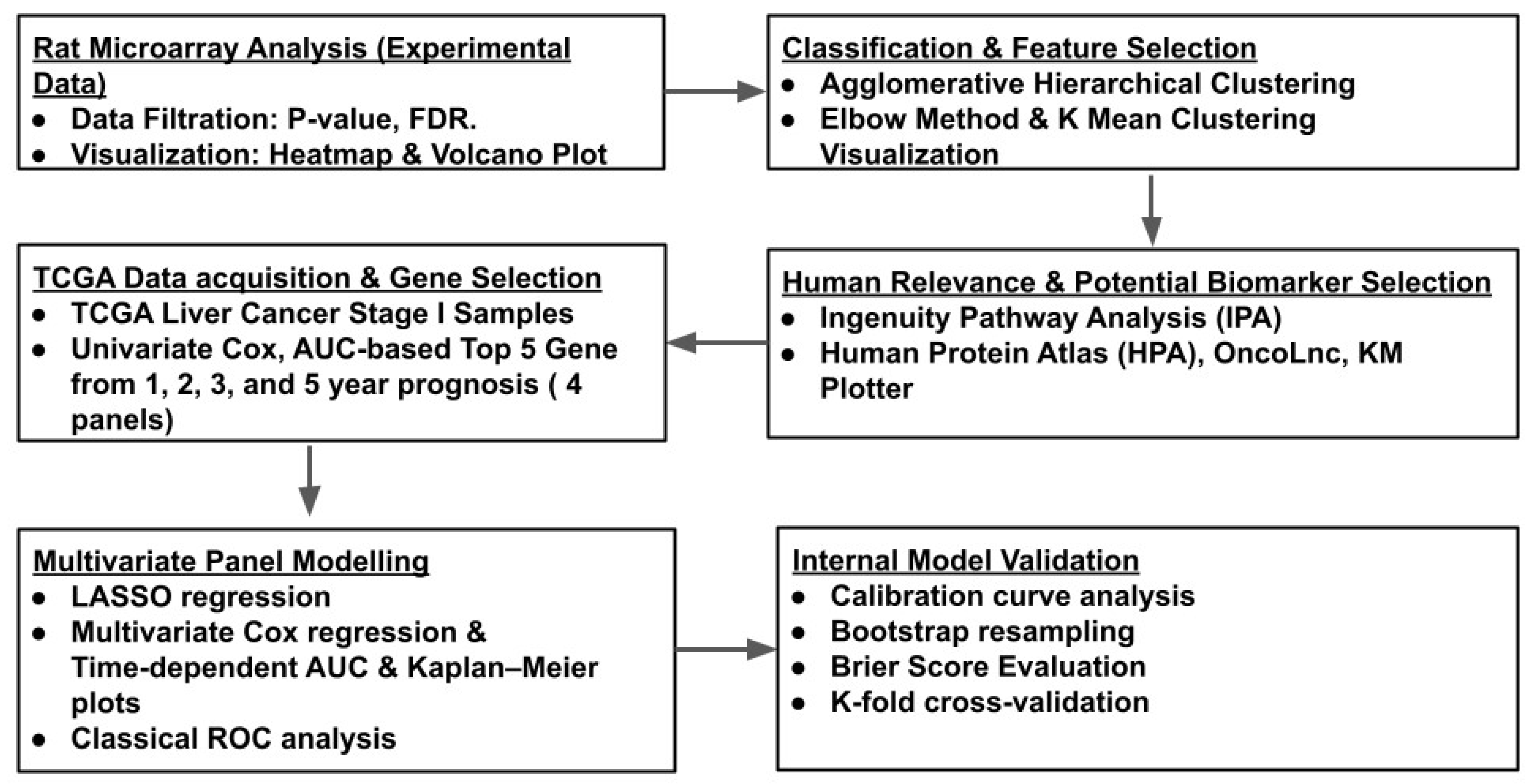 10]. Developing a prognostic biomarker panel to identify high-risk Stage I patients could be clinically beneficial for identifying those who may benefit from innovative treatments, including newer therapies. Currently, no prognostic biomarker panel specifically focused on Stage I liver cancer is available.