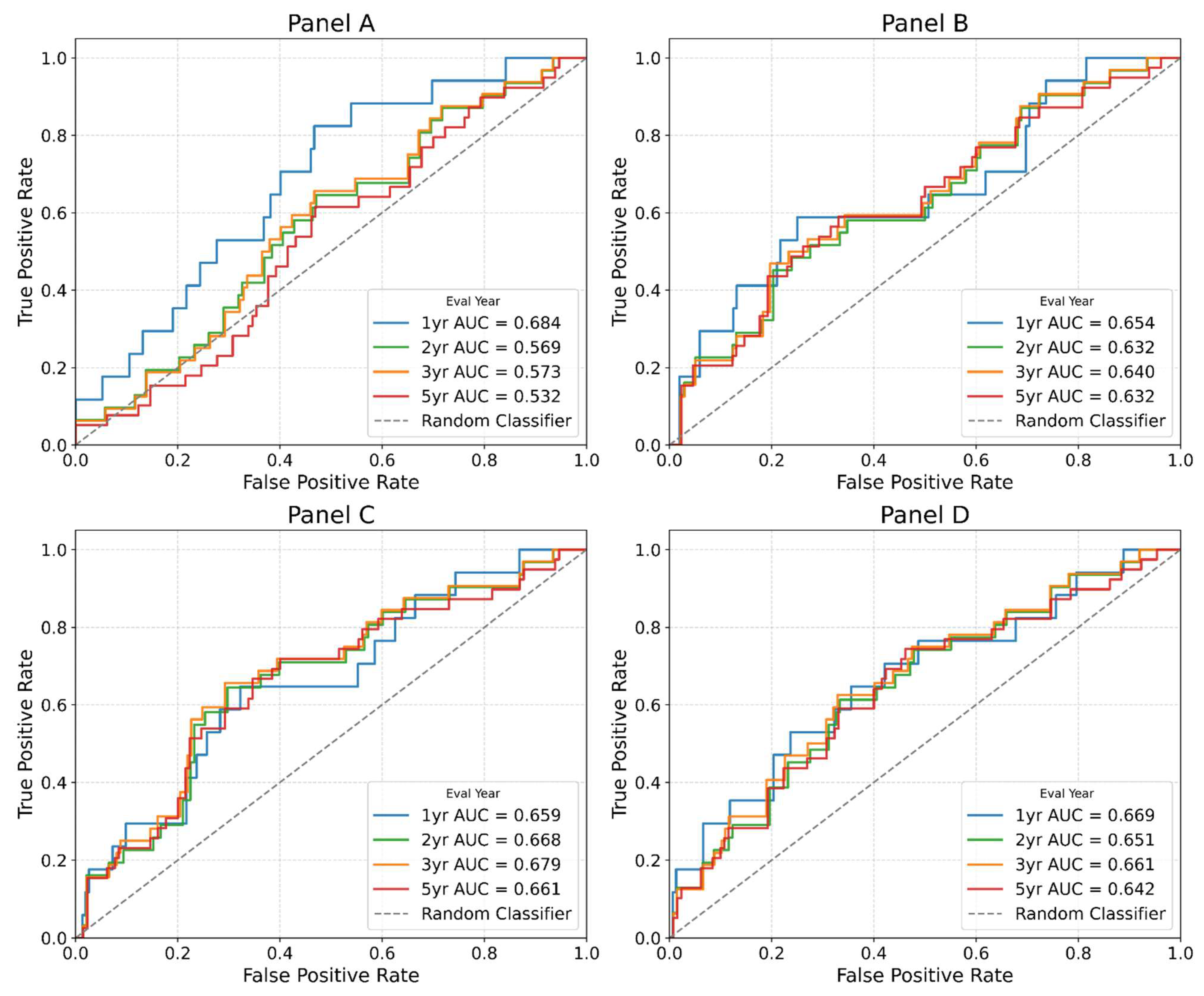 Multivariable Cox proportional hazards models were trained using the four prognostic panels (Panel-A, Panel-B, Panel-C, and Panel-D). Model performance was evaluated at 1, 2, 3, and 5 years by computing the concordance index (C-index) using the concordance_index_censored function in the sksurv.metrics module.