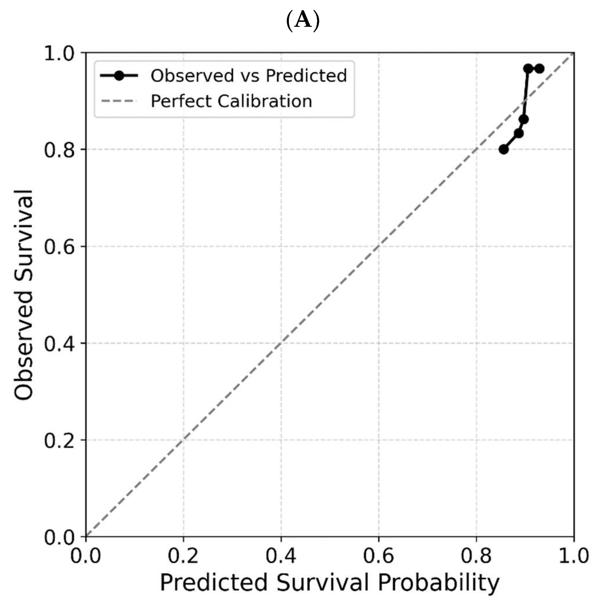 The patients were grouped into five bins based on the quantiles of the predicted survival probability. For each bin, we computed the average predicted survival and compared it with the observed survival fraction to generate the calibration curves. Observed survival was defined as 1 for patients who were alive beyond the evaluation time point and 0 for those who experienced an event (death) at or before that time. Patients censored before the evaluation time point were excluded from the analysis to ensure accuracy of the results. The calibration curve function from sklearn.calibration was used to compute the observed versus predicted survival values for each bin.