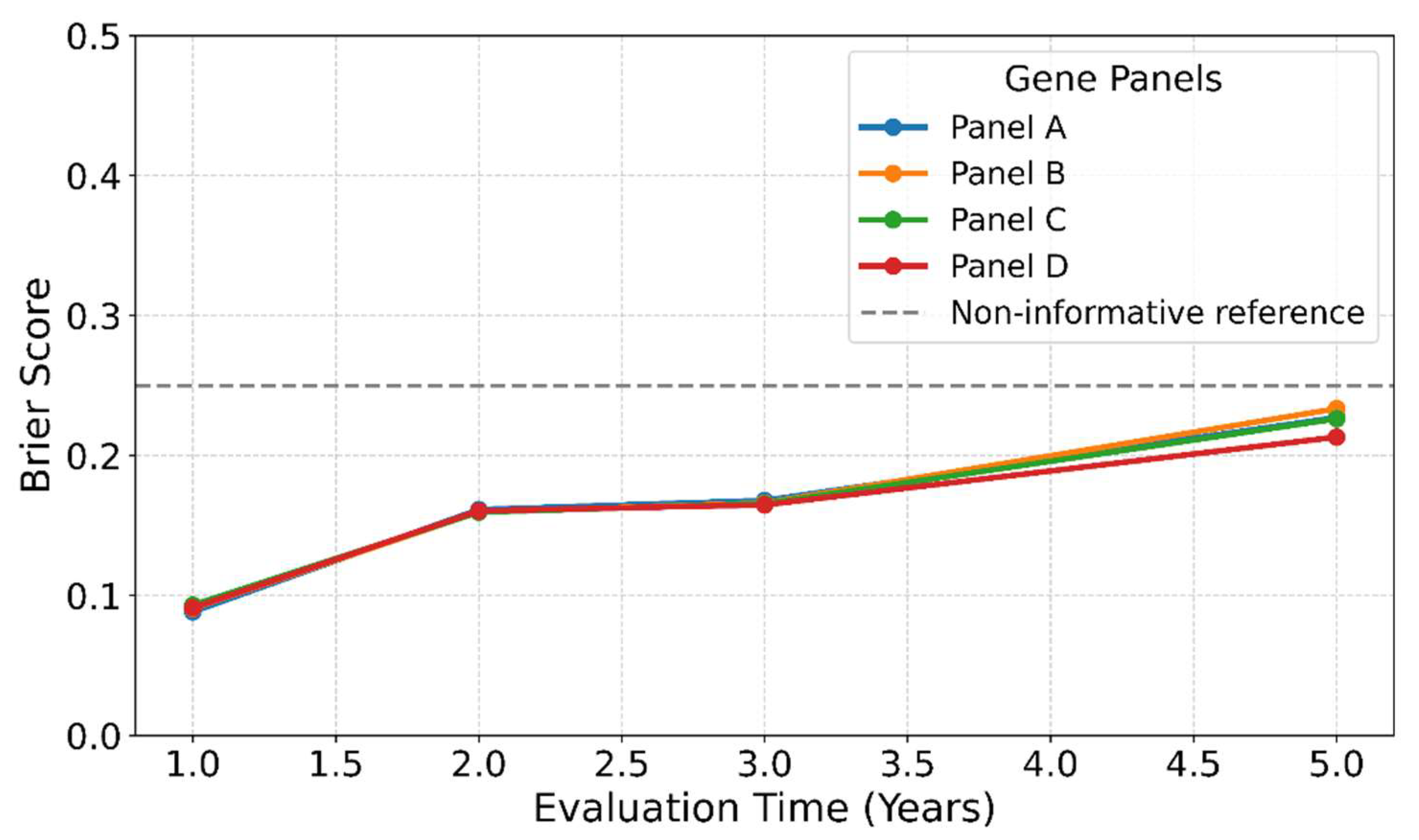 Brier scores were computed to assess the accuracy and calibration of the survival probability estimates from each gene panel when compared to actual outcomes at 1, 2, 3, and 5 years [