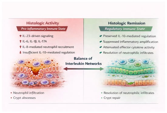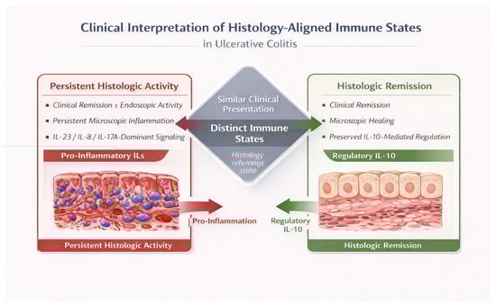 Importantly, the findings synthesized in this review support a state-based interpretation of ulcerative colitis, in which histologic activity and remission reflect coordinated inflammatory and regulatory immune states rather than transient disease phases. Within this framework, IL networks define stable histology-aligned immune configurations that underlie persistent microscopic inflammation or durable histologic remission. Reinforcing the concept of immune states in this manner provides a biologically coherent lens through which histology can be interpreted beyond clinical symptoms alone.