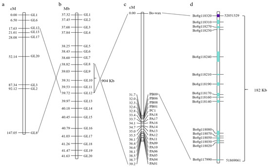 Fine mapping of candidate genes responsible for wax traits of cabbage leaves. (a,b) The wax formation gene was initially mapped within the GL8-GL12 interval on chromosome C08. (c,d) The candidate gene for wax formation was mapped to a region of 182 kb using interval targeted sequencing technology. The numbers on the left side of the bars in (a–c) represent genetic distances. The line connecting the two diagrams indicates that this is the same molecular marker. The length of the blue box indicates the gene length, while the purple box denotes the candidate gene.
