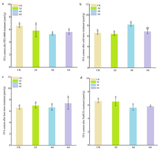 Free fatty acid content of cabbage seedlings after adverse stress treatment. (a) PEG-6000 simulated drought stress treatment. (b) Cold stress treatment. (c) Heat stress treatment. (d) NaHCO3 stress treatment. The letters above the columns indicate significance at p < 0.05.
