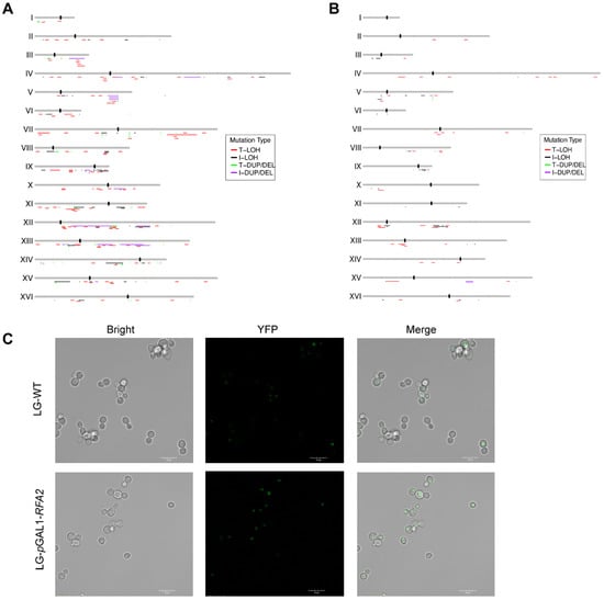 - Sui, Y.; Qi, L.; Wu, J.K.; Wen, X.P.; Tang, X.X.; Ma, Z.J.; Wu, X.C.; Zhang, K.; Kokoska, R.J.; Zheng, D.Q.; et al. Genome-wide mapping of spontaneous genetic alterations in diploid yeast cells. Proc. Natl. Acad. Sci. USA 2020, 117, 28191–28200. [Google Scholar] [CrossRef]