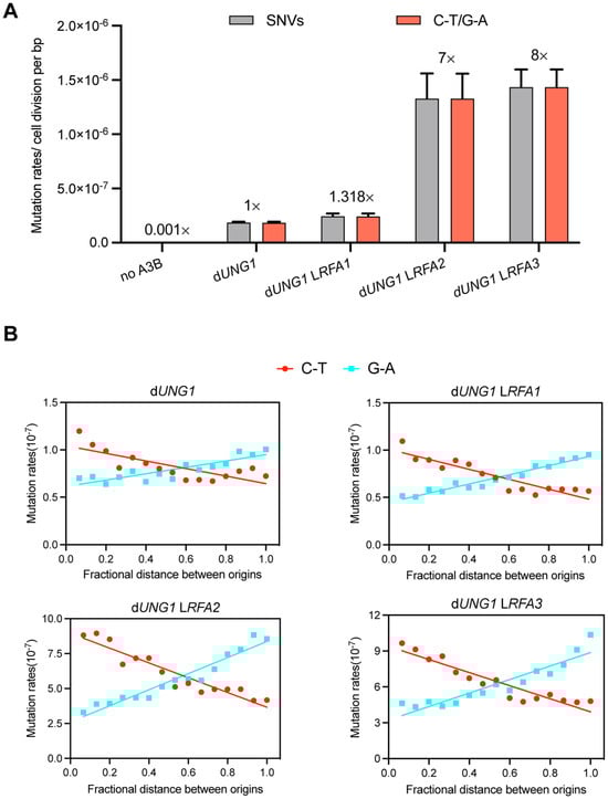 RFA deficiency exposes lagging-strand ssDNA to A3B-induced mutagenesis. (A) Mutation rates of SNVs induced by A3B. Strains lacking UNG1 (dUNG1) and expressing A3B were used as the control (normalized to 1×). The WYpGAL1-RFA strains (LRFA1, LRFA2, LRFA3) in the dUNG1 background show significantly elevated mutation rates. The vast majority of mutations were C-T/G-A transitions, characteristic of A3B activity. (B) Strand bias of A3B-induced mutations relative to replication origins. The x-axis represents the fractional distance between adjacent replication origins. The separation of C-T (red line) and G-A (blue line) frequencies demonstrates that ssDNA exposure is asymmetric and predominantly enriched on the lagging strand during replication.