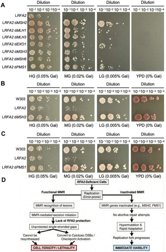 We propose that in the absence of sufficient RFA2, the initiation of MMR-mediated excision generates lethal single-stranded gaps that cannot be resynthesized, thereby converting repair attempts into cytotoxic DSBs (Figure 6D). In RFA2-deficient cells, replication is inherently error-prone. Functional MMR machinery recognizes these lesions and initiates excision repair. However, the excision step of MMR critically requires RFA-complex to protect the single-stranded template and coordinate resynthesis [47]. In the absence of RFA2, MMR initiation creates lethal, unprotected gaps that cannot be refilled [48,49]. These gaps may convert into cytotoxic double-strand breaks or trigger permanent checkpoint activation [50]. Thus, active MMR becomes toxic to the cell. By inactivating MMR genes, cells effectively stop these abortive repair attempts. They trade genetic fidelity for immediate viability, allowing the replication fork to progress despite the high error rate [51]. This strategy is similar to the mechanisms observed in fungal pathogens and cancers, where hypermutations promote rapid adaptation [52].