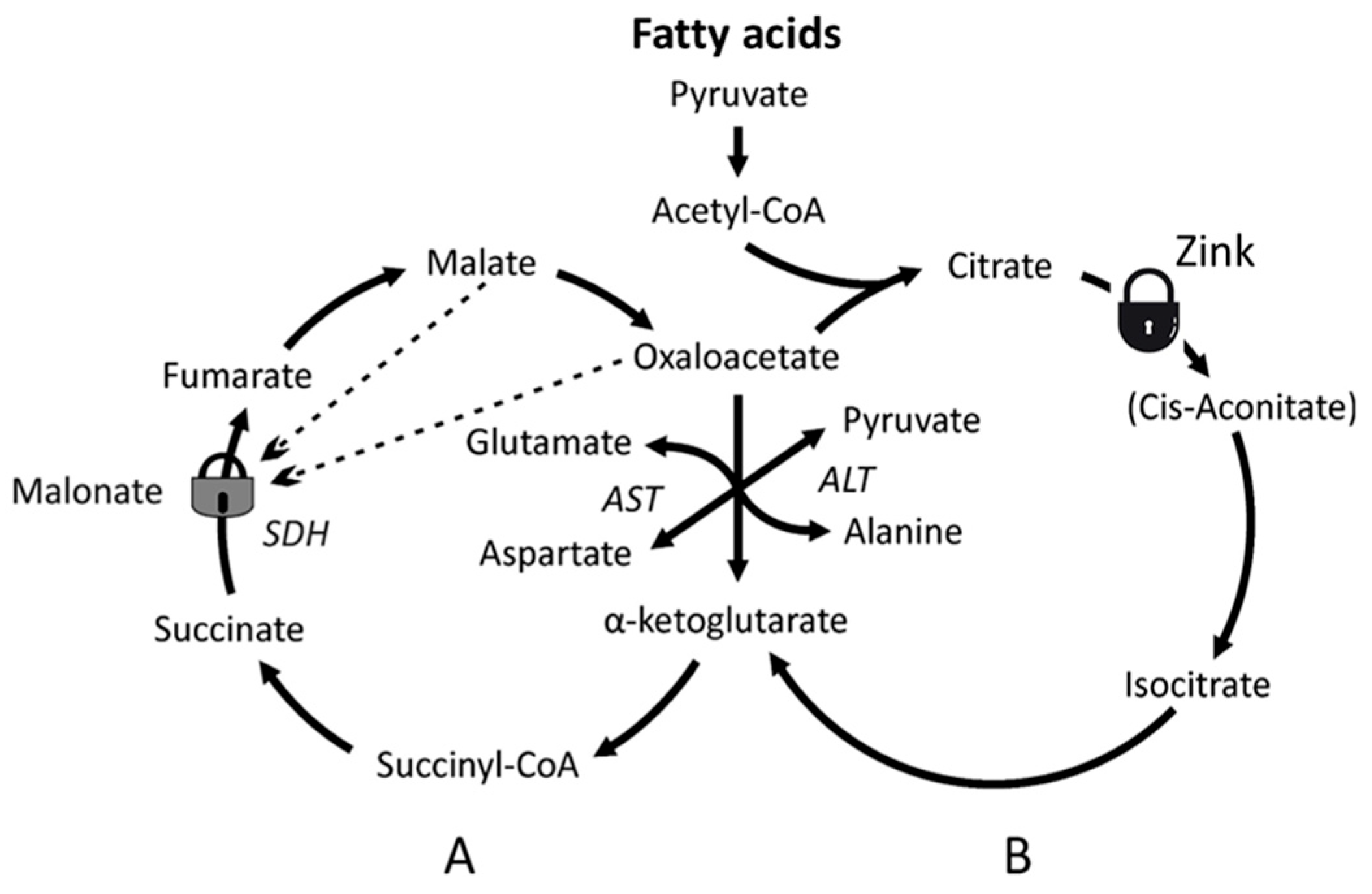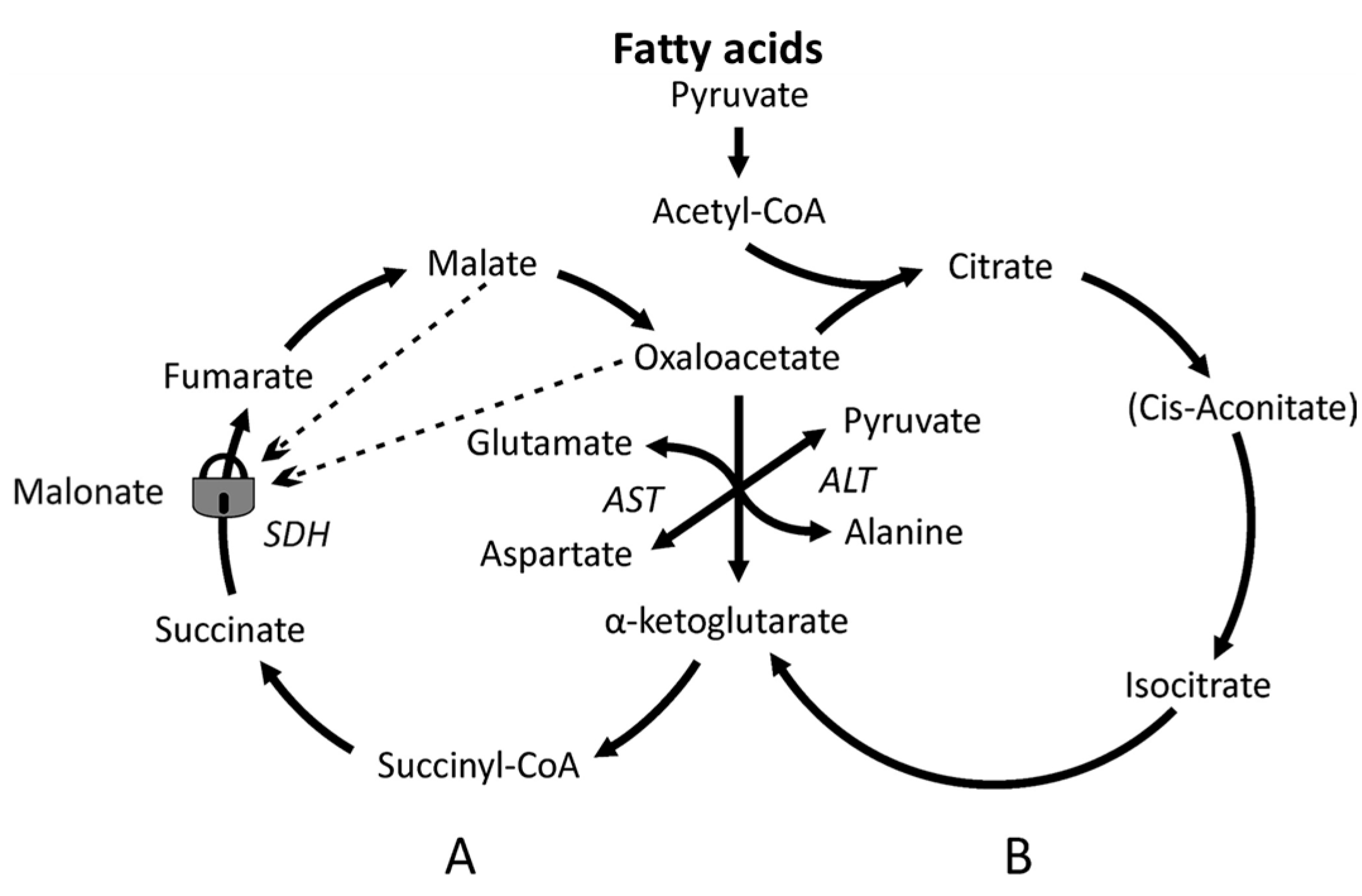 - The excess of α-ketoglutarate, formed by ALT and AST, rapidly undergoes transformations in cycle A, creating an excess of OAA, which in turn becomes a substrate for cycle B. Both cycles become conjugated and are irreversible. This allows intermediate metabolites of cycle B to be directed into other metabolic pathways. Depending on the organ, citrate can be directed to lipid synthesis, accumulate in prostatic fluid, or be converted to isocitrate and used in the transhydrogenase reactions to transfer the mitochondrial redox equivalents of NADH to the cytosolic NADPH [40].