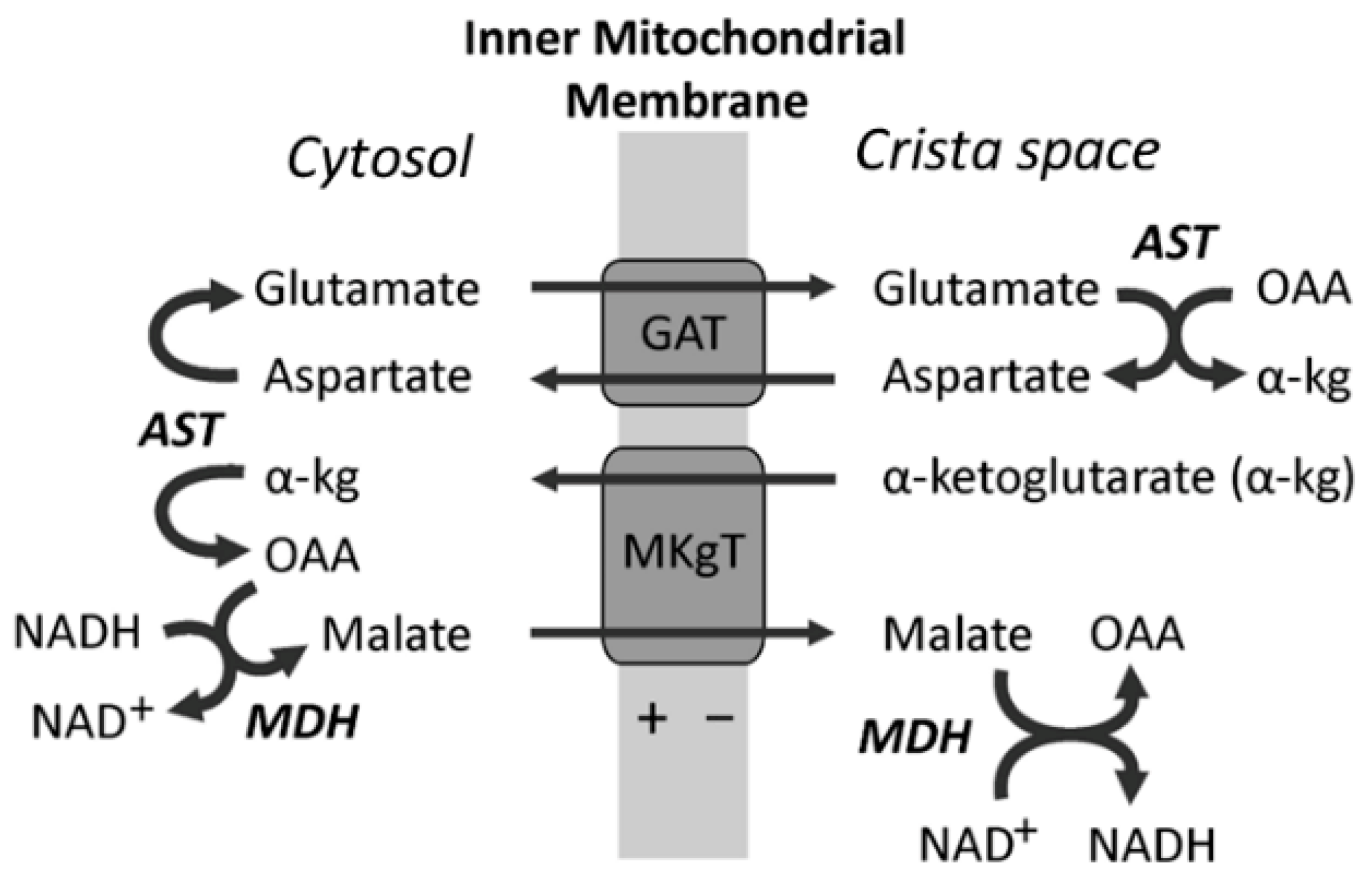 - On the cytoplasmic side of the mitochondria, LDH converts lactate into pyruvate and H+ to form NADH. For fast oxidation of pyruvate, it is necessary to rapidly oxidize the cytoplasmic NADH and transfer the electrons into the space of the cristae. For this purpose, there is a malate aspartate shunt (MAS) (Figure 3). MAS transports electrons by transferring reducing equivalents of NADH from the cytoplasm to the crista space. MAS consists of two enzymes, malate dehydrogenase (MDH) and aspartate aminotransferase (AST), located on either side of the cristae membrane (Figure 3), and two carriers across the cristae membrane: glutamate/aspartate transporter (GAT) and malate/α-ketoglutarate transporter (MKgT). The importance of MAS has been proven in experiments with inhibitors of the transaminase and SDH [39]. Although aminotransferases are reversible enzymes, in MAS, AST works only in one direction: in the cytoplasm, aspartate + α-ketoglutarate → OAA + glutamate, and in the cristae, OAA + glutamate → aspartate + α-ketoglutarate (Figure 3).