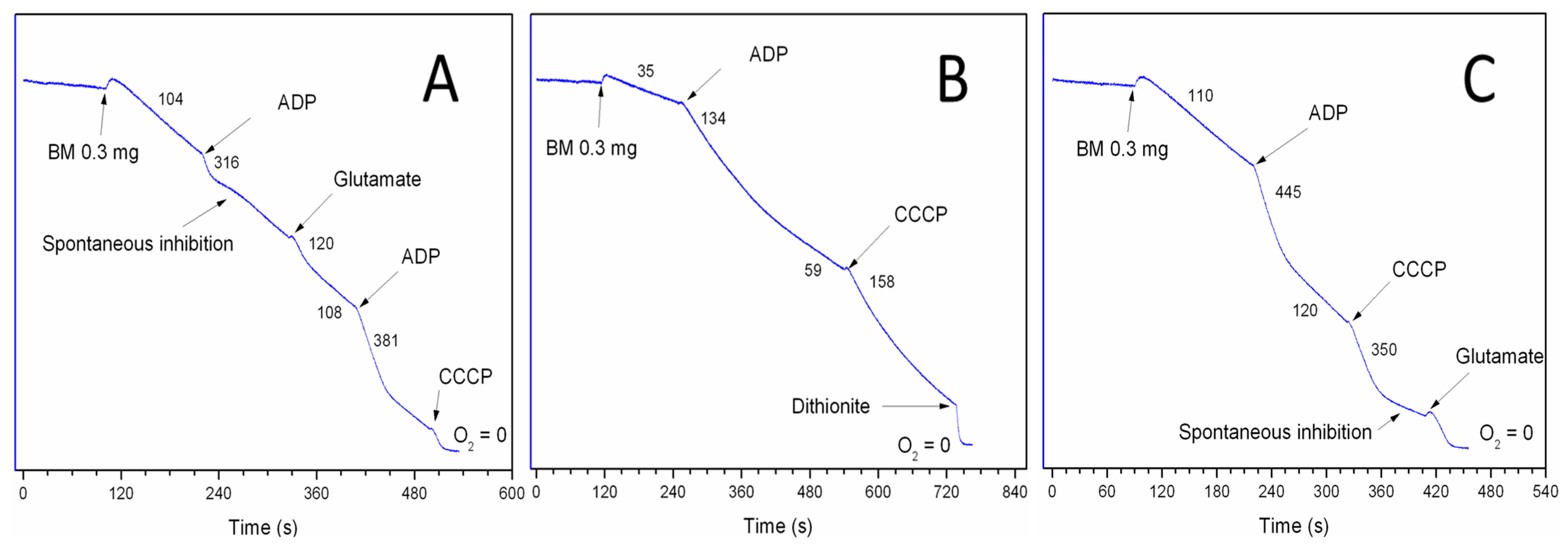 - Panov, A.; Orynbayeva, Z. Determination of mitochondrial metabolic phenotype through investigation of the intrinsic inhibition of succinate dehydrogenase. Analyt. Biochem. 2018, 552, 30–37. [Google Scholar] [CrossRef]