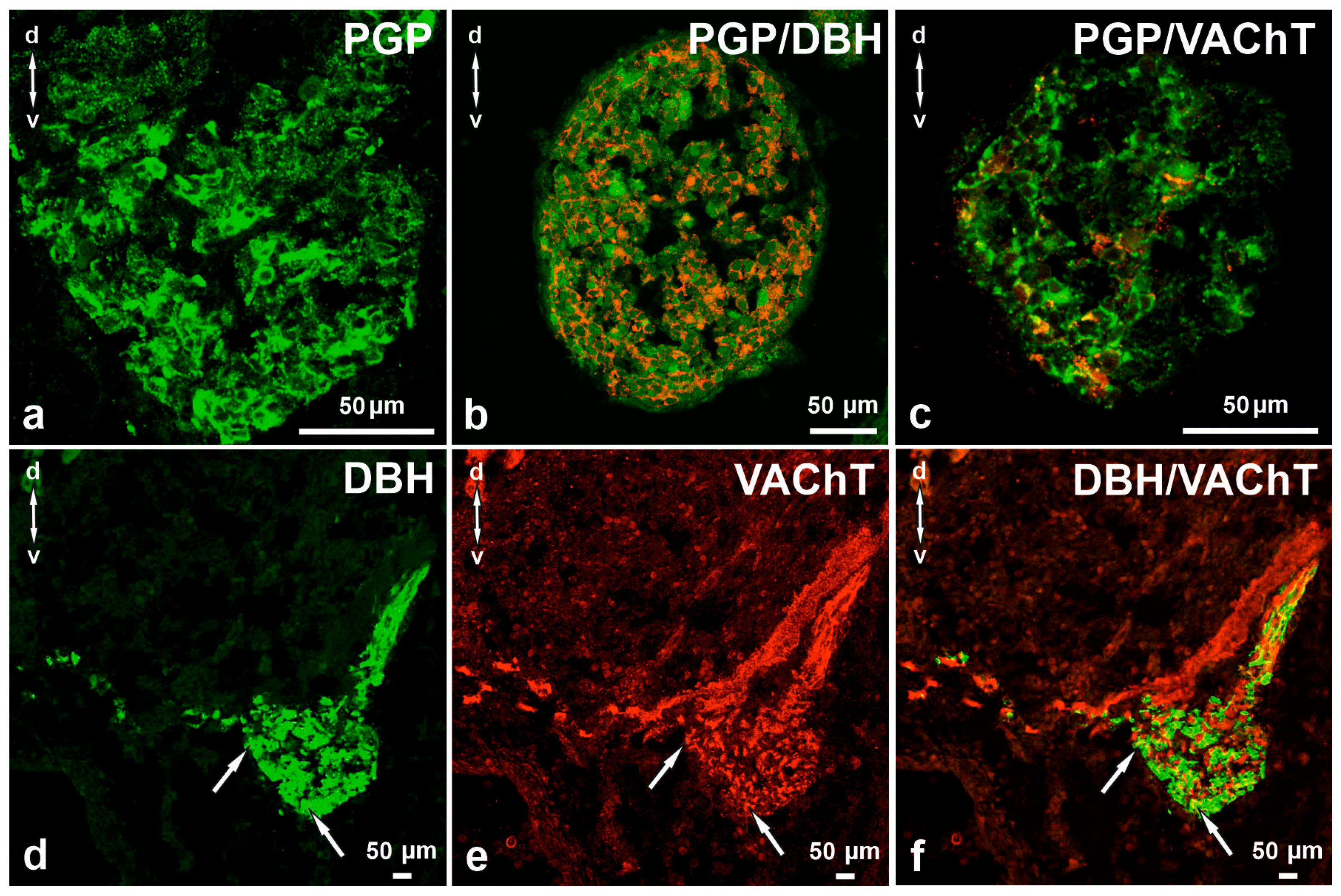 - Masliukov, P.M.; Timmermans, J.P. Immunocytochemical properties of stellate ganglion neurons during early postnatal development. Histochem. Cell Biol. 2004, 122, 201–209. [Google Scholar] [CrossRef]