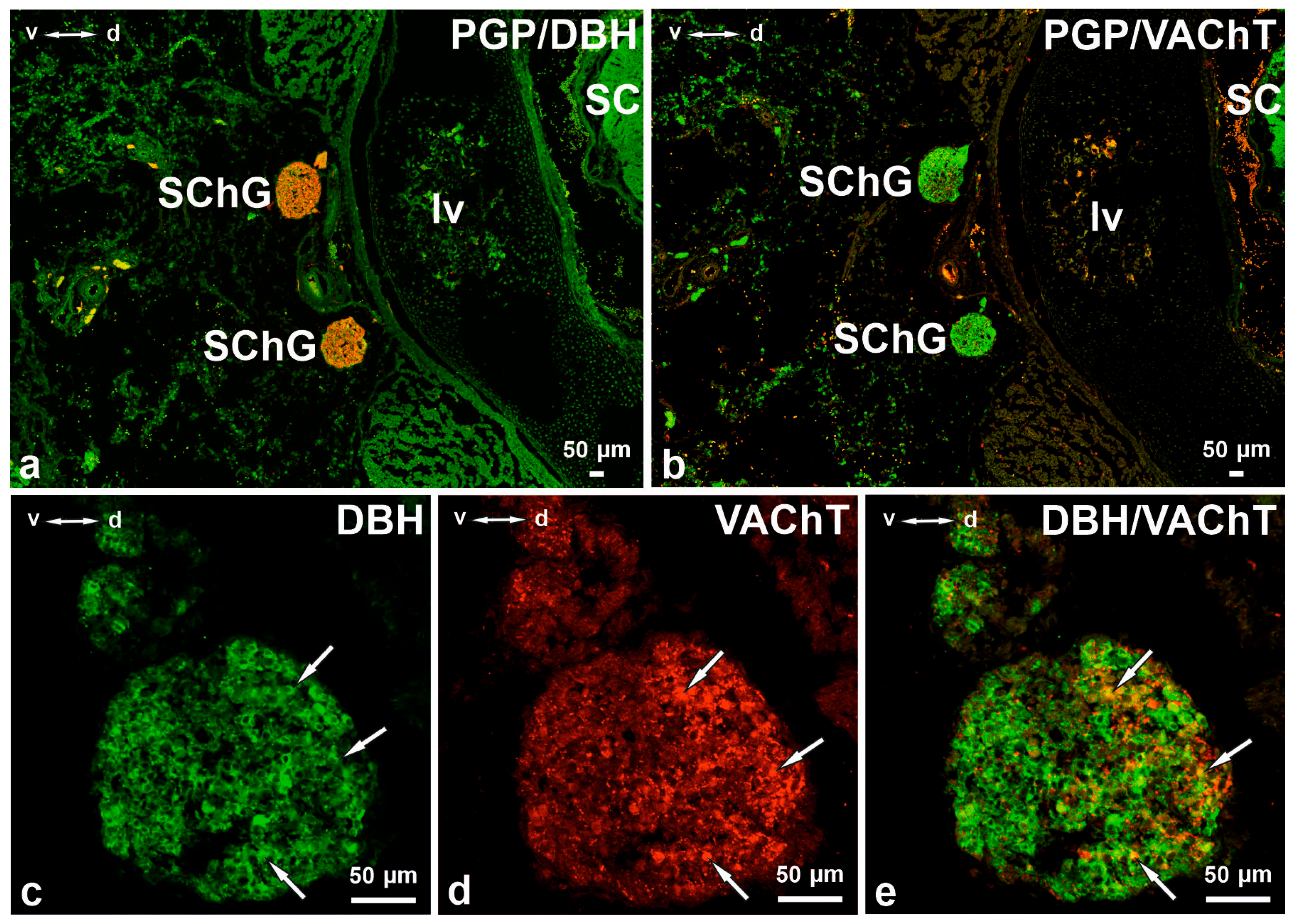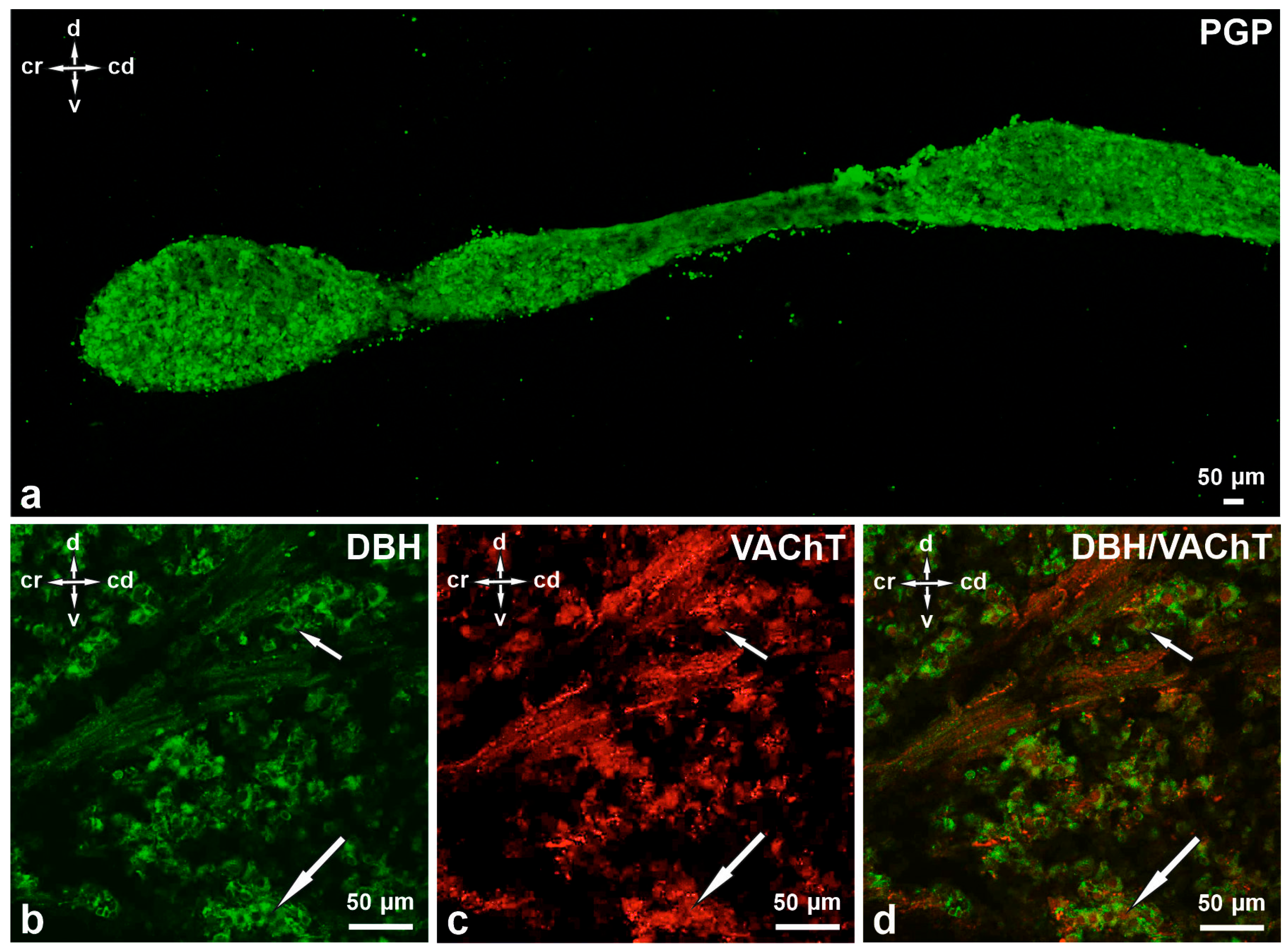 - Schütz, B.; von Engelhardt, J.; Gördes, M.; Schäfer, M.-H.; Eiden, L.; Monyer, H.; Weihe, E. Sweat gland innervation is pioneered by sympathetic neurons expressing a cholinergic/noradrenergic co-phenotype in the mouse. J. Neurosci. 2008, 156, 310–318. [Google Scholar] [CrossRef]