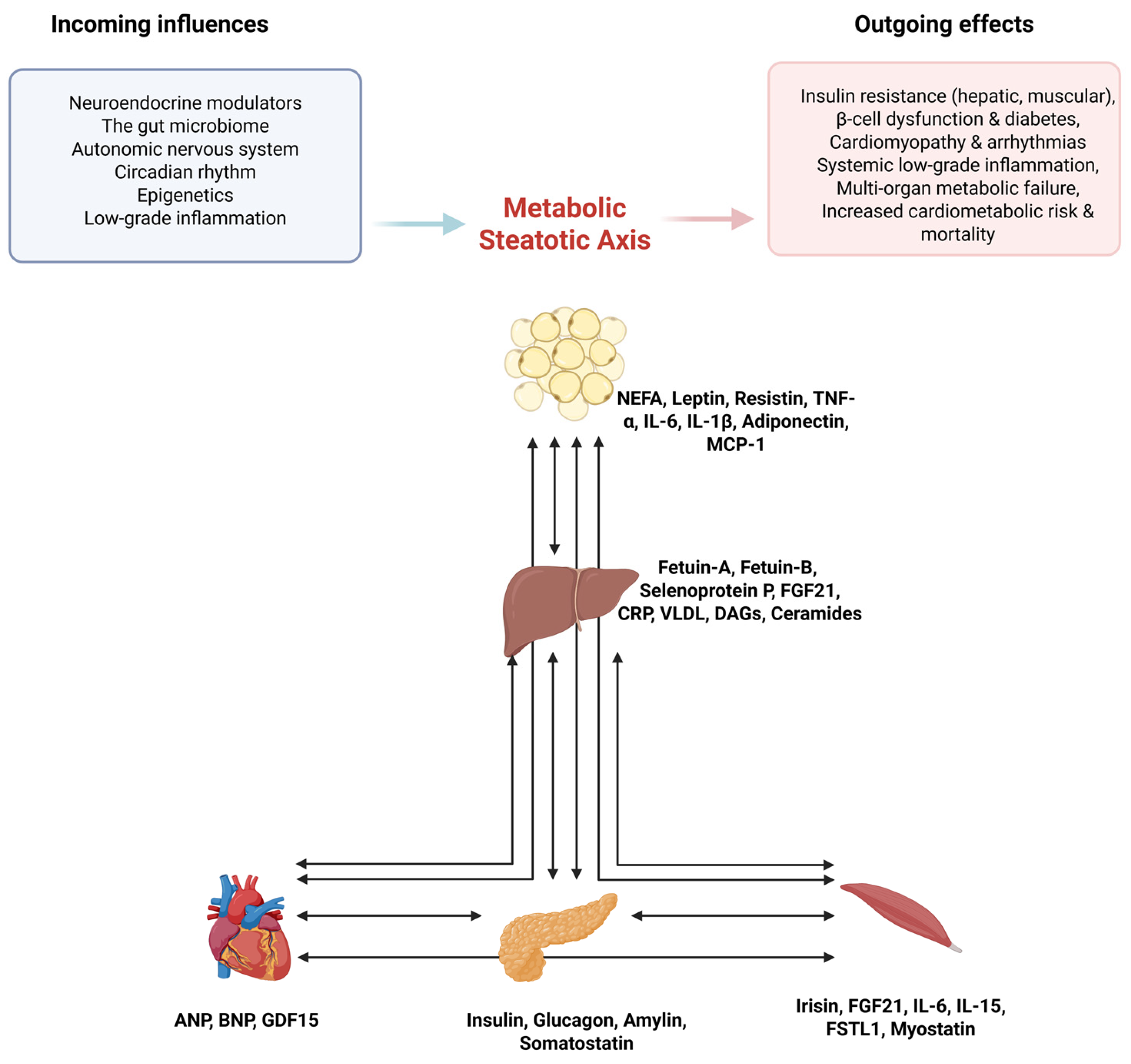 | Pancreas | Insulin, Amylin, Glucagon | Liver | ↑ Lipogenesis, altered glucose metabolism | Human evidence | Serum insulin, glucagon | [73,74,75] |