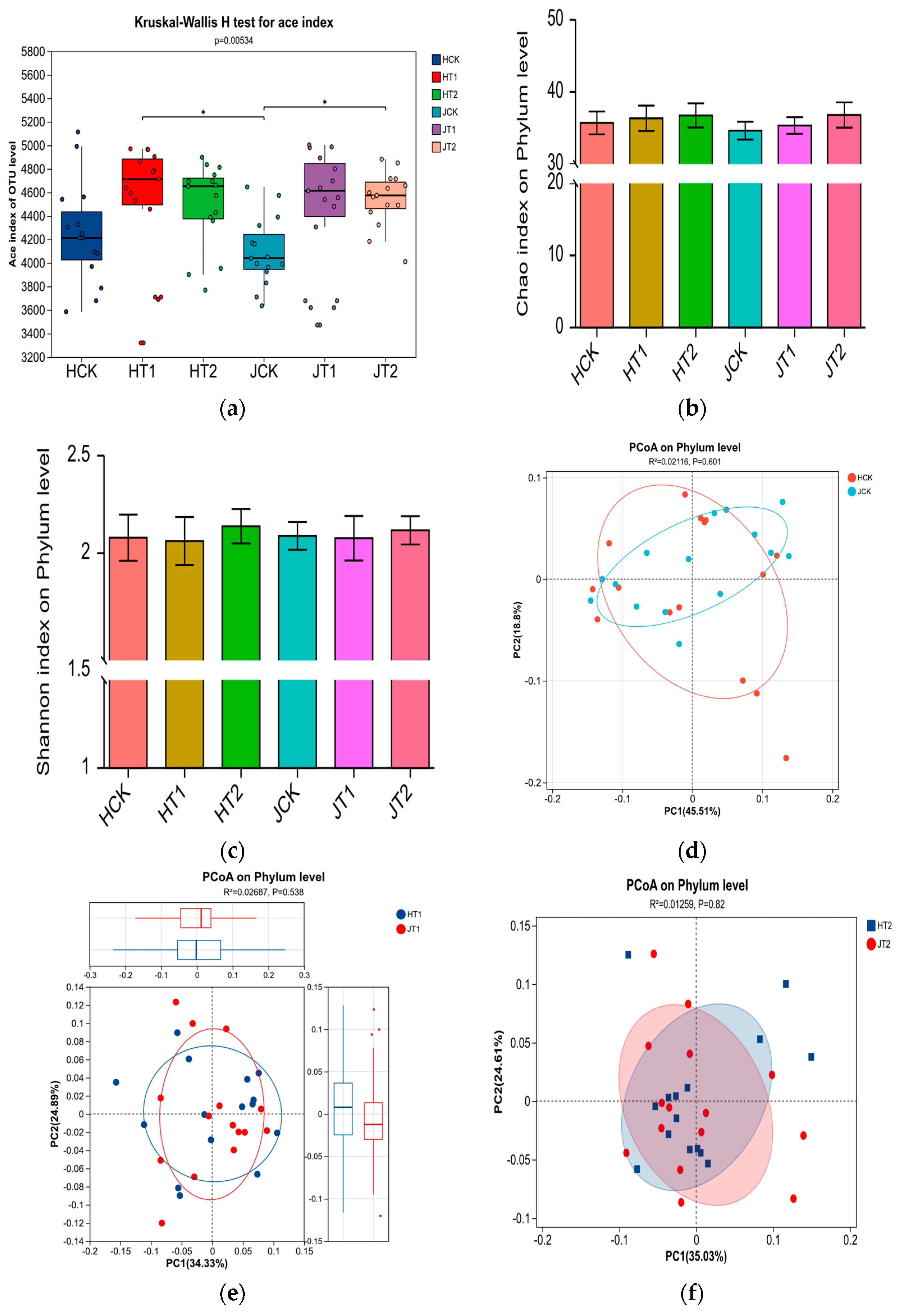 - Chen, Z.; Jin, Z.X.; Zeng, C.Y.; Zhang, Y.H.; He, C.Y. Effects of Microbial Inoculant Application on Growth of Codonopsis pilosula and Rhizosphere Soil Microbial Community Structure. Soil Fertil. Sci. China 2025, 108–116. (In Chinese) [Google Scholar]
