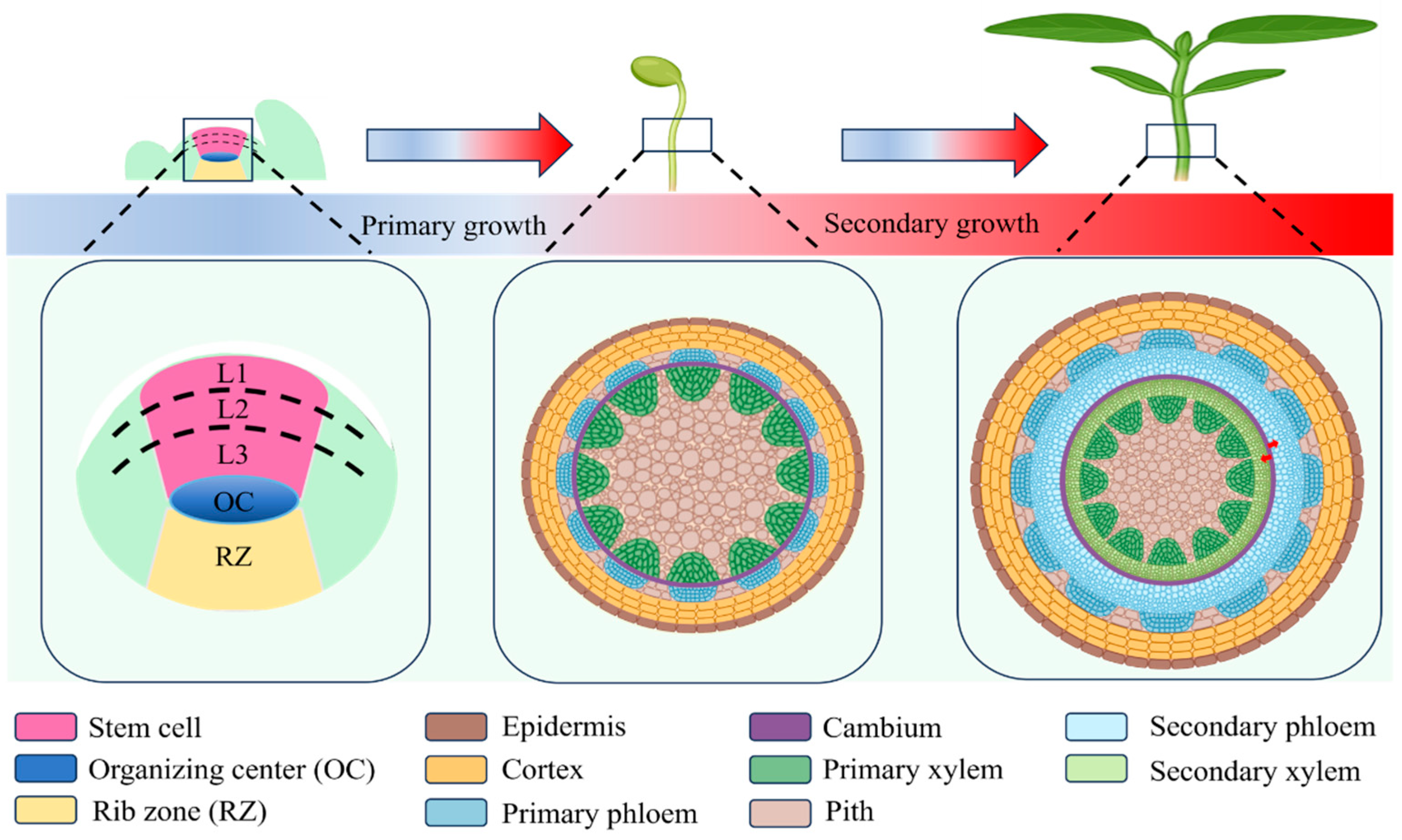 - Ragni, L.; Greb, T. Secondary growth as a determinant of plant shape and form. Semin. Cell Dev. Biol. 2018, 79, 58–67. [Google Scholar] [CrossRef]