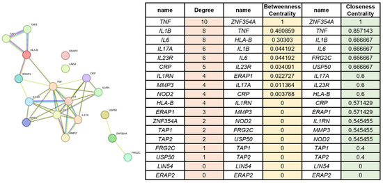 Disease-centric gene network and centrality metrics. Protein–protein interaction (PPI) network of AS-associated genes retrieved from GeneCards (relevance ≥ 20). Nodes represent genes, and edges represent high-confidence interactions (STRING score ≥ 0.7). Centrality analysis identified key nodes including TNF, IL1B, IL6, IL17A, and IL23R.