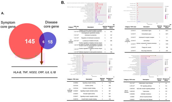 Overlap between symptom-core and disease-core gene sets and functional enrichment of disease-core genes. (A) Venn diagram showing limited overlap (n = 6) between the 145 symptom-core genes and the 18 disease-core genes. Shared genes included HLA-B, TNF, NOD2, CRP, IL6, and IL1B. (B) Gene Ontology (GO) and KEGG enrichment of the overlapped gene set. Functional categories were largely confined to broad immune-related processes, including adaptive immune response, cytokine activity, and inflammatory signaling.