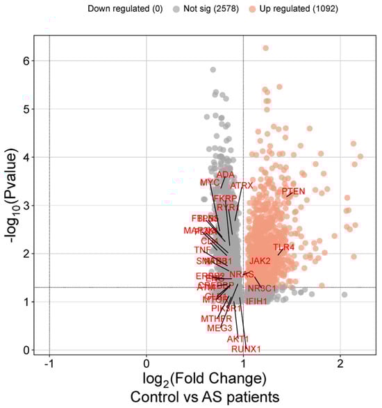 Differential expression analysis was performed with adjustment for multiple testing using the Benjamini–Hochberg false discovery rate (FDR) procedure. Both nominal p-values and FDR-adjusted p-values were calculated, and effect size estimates were used to facilitate interpretation of biological relevance. Among these, five genes (PTEN, TLR4, JAK2, NRAS, and NR3C1) showed nominally increased expression in AS patients compared to healthy controls (Figure 4). PTEN exhibited a fold change of 1.436 (nominal p = 0.000678), followed by TLR4 (fold change = 1.349, nominal p = 0.011243), JAK2 (fold change = 1.285, nominal p = 0.012802), NRAS (fold change = 1.067, nominal p = 0.024315), and NR3C1 (fold change = 1.109, nominal p = 0.028972).