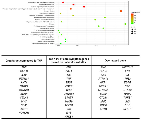 13 genes directly linked to TNF and 14 genes ranked within the top 10% in network centrality among the 145 core symptom-associated genes were first selected. The 14 genes with high network centrality were FN1, AKT1, IL6, TP53, EGFR, SRC, CTNNB1, STAT3, MMP9, TGFB1, INS, IL1B, NFKB1, and MYC. After removing overlapping entries such as AKT1, CTNNB1, and MYC, which appeared in both groups, a final set of 24 unique genes was constructed. This 24-gene set was then subjected to Reactome pathway enrichment analysis, which identified several statistically significant pathways primarily related to immune function and inflammatory signaling. Notably, the most significantly enriched pathways included Interleukin-4 and Interleukin-13 signaling, Cytokine signaling in the immune system, and Interleukin-10 signaling, all showing high −log10(p-value) scores above 14 (Figure 5).