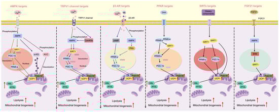 Additional studies further support AMPK as an upstream initiator of thermogenic programming. Salvianolic acid A (Sal A)–induced browning is markedly attenuated by pharmacological or genetic inhibition of AMPK, whereas silencing SIRT1 does not affect AMPK phosphorylation, indicating a unidirectional regulatory hierarchy in which AMPK functions upstream of SIRT1 [12]. These findings reinforce the role of AMPK as a primary trigger of downstream thermogenic signaling in response to dietary compounds.