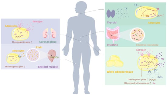 Additional molecular and endocrine targets implicated in the regulation of white adipose tissue (WAT) browning. Beyond canonical thermogenic pathways, emerging regulators such as estrogen, thyroid hormones, and muscle-derived myokines (e.g., irisin) have been shown to influence beige adipocyte recruitment and thermogenic capacity. These factors act through their respective receptors expressed in adipose tissue and interact with metabolic and endocrine signaling networks to modulate WAT plasticity, particularly under conditions of obesity and metabolic stress.