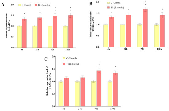 From 4 to 120 h post-sporozoite infection, the Fas and TNFR1 mRNA expression levels in Group T0’s host cells were significantly or highly significantly greater than those in Group C (p < 0.05 or p < 0.01). At 72 h and 120 h post-infection, the TRAIL mRNA expression in Group T0 was also significantly elevated compared to Group C (p < 0.05). See Figure 1 for details.