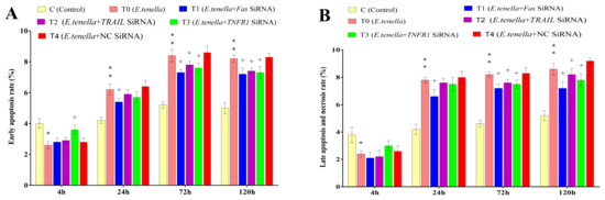 The effects of Fas, TRAIL, and TNFR1 siRNA on the apoptosis of E. tenella host cells. (A) represents the early apoptosis rate. (B) represents the rate of late apoptosis and necrosis. Note: Compared with Group C, “*” indicates a significant difference and “**” indicates a highly significant difference. Compared with Group T4, “+” indicates significant difference (p < 0.05).