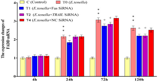 The effects of Fas and TRAIL siRNA on FADD protein expression in E. tenella host cells. Note: Compared with Group C, “**” indicates a highly significant difference. Compared with Group T4, “+” indicates significant difference (p < 0.05).