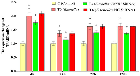 The effect of TNFR1 siRNA on TRADD protein expression in E. tenella host cells. Note: Compared with Group C, “*” indicates a significant difference and “**” indicates a highly significant difference. Compared with Group T4, “+” indicates significant difference (p < 0.05).