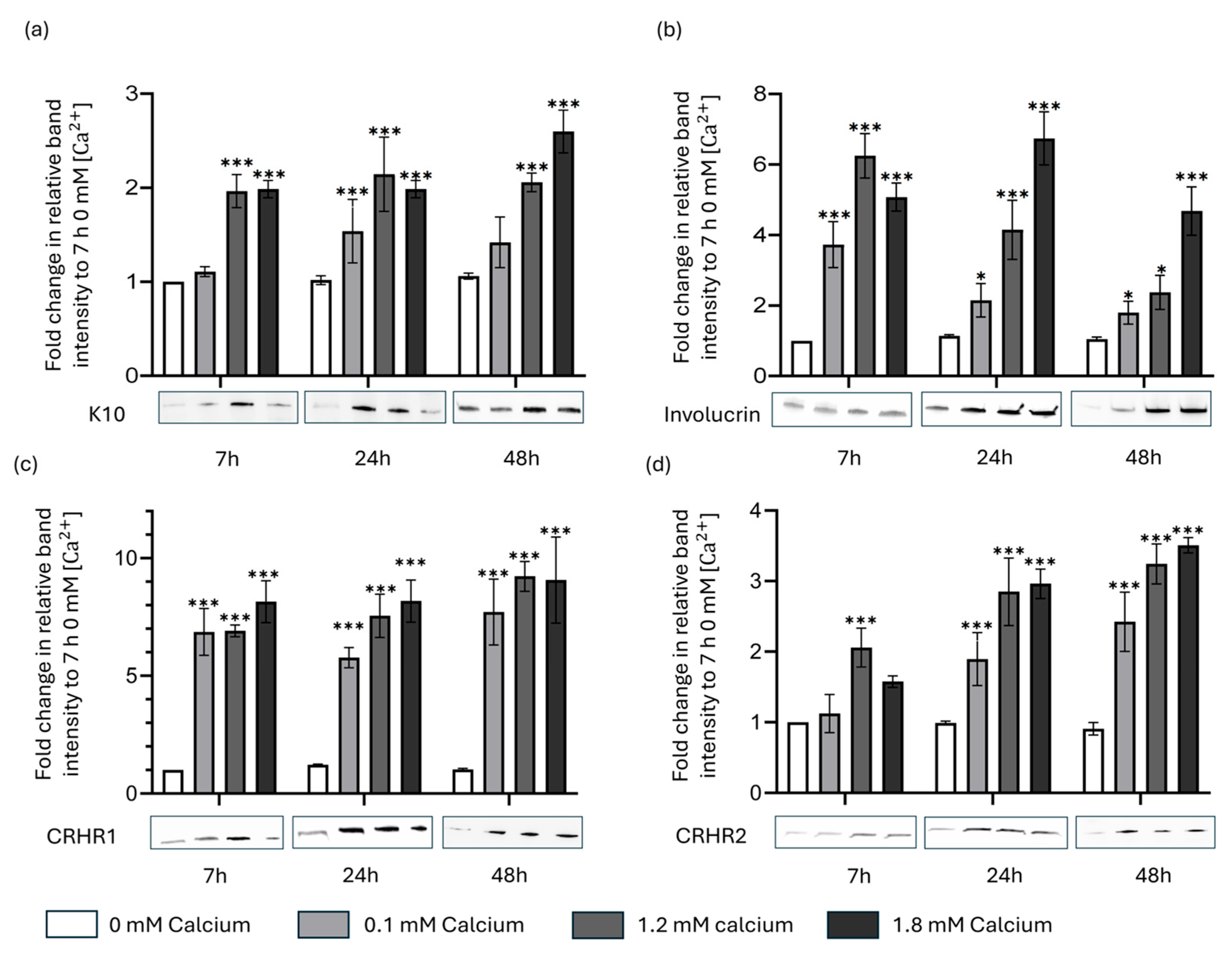 3.2. Western Blot Quantification of CRHR1 and CRHR2 Expression in HaCaT Cell Line Under Calcium-Induced Differentiation