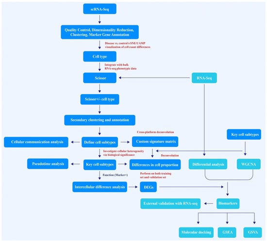 Single-cell RNA sequencing (scRNA-seq) can reveal the heterogeneity of cells in tissues and the mechanism of disease [6,7], providing a new perspective for analyzing cell dynamics and interactions during RF. However, despite its advantages over bulk RNA-seq in capturing cellular diversity within complex tissues, there are several limitations, including limited sample sizes, tissue dissociation bias, and insufficient sensitivity for detecting low-expression genes [8]. To overcome the limitations of the aforementioned methods, this study integrates CIBERSORTx with the Scissor algorithm to enable collaborative analysis of single-cell and batch transcriptomic data. Specifically, the Scissor algorithm correlates single-cell transcriptomes with clinical phenotypes to identify key cell subpopulations associated with disease states [9]. Meanwhile, CIBERSORTx constructs tissue-specific feature matrices from single-cell data and employs deconvolution analysis to resolve cell type composition and proportions from batch transcriptomic data. This combined approach systematically reveals phenotypically relevant cell subpopulations and their molecular characteristics during RF progression [7,10,11]. Through this integrated analytical framework, key cellular subtypes and biomarkers implicated in RF progression were systematically delineated, thereby providing a conceptual framework and putative molecular targets for early diagnosis and precision therapeutic intervention. Furthermore, bioinformatically predicted biomarkers were validated by quantitative polymerase chain reaction (qPCR) in mouse models of renal injury and fibrosis, confirming their expression patterns and reinforcing their translational relevance. The study workflow is presented in Figure 1.