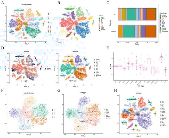 Scissor is a novel approach that utilizes the phenotypes, such as disease stage, tumor metastasis, treatment response, and survival outcomes, collected from bulk assays to identify the most highly phenotype-associated cell subpopulations from single-cell data. The workflow of Scissor is shown in Figure S1A [22]. The Scissor (v2.0.0) package was utilized to conduct association analysis in GSE195718 and GSE76882 datasets, to identify RF-associated cell types (alpha = 0.001 and family = binomial) [9]. Scissor+ denotes a positive association with the disease, Scissor− denotes a negative association, and a value of 0 indicates no statistically significant correlation. Building upon these identified RF-associated cell types, the ROGUE (v1.0) package was applied to compute heterogeneity scores for these cells [23]. Lower scores reflect greater cellular heterogeneity. Further integrating the Scissor analysis results, we selected cell types with lower heterogeneity scores and performed secondary clustering analysis on them using the same analytical procedure [24,25]. For single-cell subclusters that could not be annotated to previously reported cells, the FindMarkers function was employed to identify differentially expressed genes (DEGs) with thresholds of |log2FoldChange (FC)| > 0.5 and adjusted p-value < 0.05 between the non-annotated subclusters and other subclusters. Subsequent functional annotation was supported by Gene Ontology (GO) and Kyoto Encyclopedia of Genes and Genomes (KEGG) enrichment analyses performed on the identified DEGs. The proportion of each cell subtype within the sample was quantified and presented.