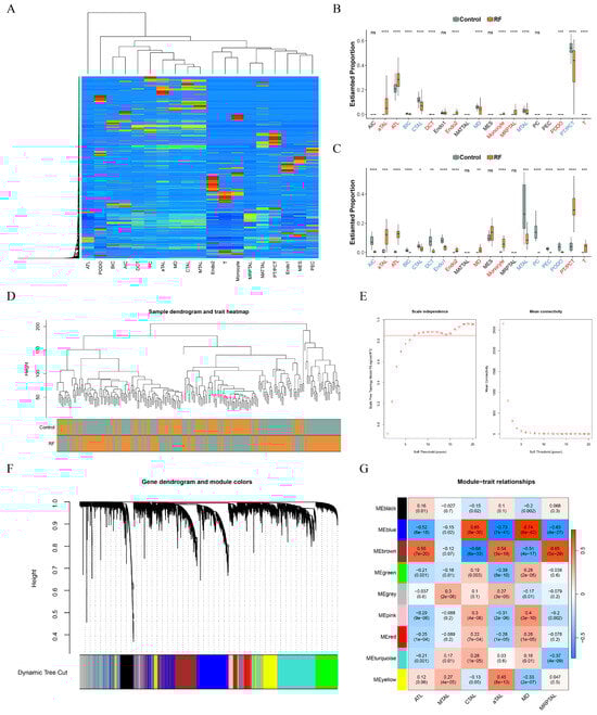 Identification of key cell subtypes from TAL. (A) Heatmap of CIBERSORTx deconvolution results. (B) Box plot showing the proportion of cells in the RF group and the control group in GSE76882 dataset; (C) box plot showing the proportion of cells in the RF group and the control group in GSE135327 dataset; (D) clustering results of WGCNA in GSE76882 dataset; (E) selection of soft threshold; (F) gene dendrogram and module colors; and (G) heat map of the correlation between modules and traits. ns: not significant, * p < 0.05, ** p < 0.01, *** p < 0.001, and **** p < 0.0001.