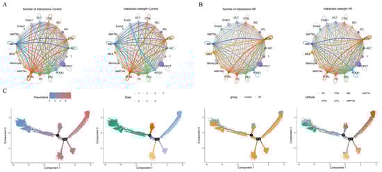 Cellular communication and pseudotime analysis. (A) Cellular communication network illustrating the number (left) and strength (right) of interactions among cell types in the control group; (B) Cellular communication network illustrating the number (left) and strength (right) of interactions among cell types in the RF group; (C) Time trajectory of TAL in pseudotime trajectory analysis (upper left); Cell state distribution of TAL in pseudotime trajectory analysis (upper right); Time trajectory of TAL in the RF group and the control group (lower left); Cell subtypes distribution of TAL in pseudotime trajectory analysis (lower right). Nodes 1–3 indicate trajectory branch points (bifurcations), highlighting positions of cell fate divergence during differentiation.
