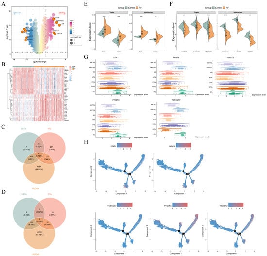 Identification of biomarkers. (A) Volcano plot of differentially expressed genes (DEGs) between the RF group and the control group in the GSE76882 dataset; (B) heatmap of top 20 upregulated and downregulated DEGs in the GSE76882 dataset, ranked by |log2FC|; (C) Venn diagram of 378 DEGs in aTAL, 421 DEGs in the GSE76882 dataset, and 4699 key module genes; (D) Venn diagram of 174 DEGs in cTAL, 421 DEGs in the GSE76882 dataset, and 4699 key module genes; (E) violin plot of STAT1 and PARP8 expression across samples in the GSE76882 and GSE135327 datasets; (F) violin plot of HS6ST2, PTGER3, and TMEM207 expression across samples in the GSE76882 and GSE135327 datasets; (G) expression of biomarkers in cell subtypes of TAL; and (H) biomarker expression in pseudotime trajectory analysis. Nodes 1–3 indicate trajectory branch points (bifurcations), highlighting positions of cell fate divergence during differentiation. * p < 0.05 and *** p < 0.001.