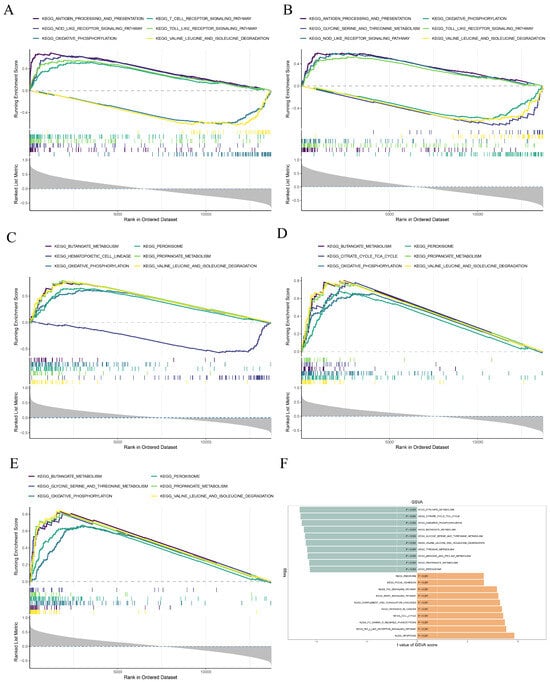 To investigate how varying biomarker expression levels influence pathway dynamics during RF progression, the clusterProfiler package (v4.7.1.001) was utilized for Gene Set Enrichment Analysis (GSEA) [31]. The gene-biomarker correlations in the GSE76882 dataset were computed, followed by gene ranking by correlation coefficient for GSEA (|NES| > 1 and adjusted p < 0.05). To further characterize pathway-level changes, Gene Set Variation Analysis (GSVA) was implemented. The GSVA package was utilized to quantify pathway activity scores in the GSE76882 dataset, and the limma package was employed to conduct differential pathway analysis between the RF and control groups (|t| > 2 and p < 0.05). All analyses adopted the KEGG gene set (c2.cp.kegg.v7.0.symbols.gmt) from MSigDB (https://www.gsea-msigdb.org/gsea/msigdb) (accessed on 4 June 2025) as a reference set.
