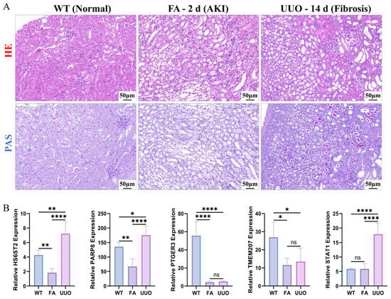 Histological examination and biomarker expression analysis in mouse renal tissues. (A) Representative images of hematoxylin and eosin (H&E) and periodic acid–Schiff (PAS) staining of kidney sections from the normal control group (WT), the folic acid-induced acute kidney injury group (FA, AKI), and the unilateral ureteral obstruction-induced chronic renal fibrosis group (UUO, Fibrosis). Staining was used to evaluate renal tubular and glomerular structure and to assess pathological injury. Scale bar: 50 μm; (B) mRNA expression levels of HS6ST2, PARP8, PTGER3, TMEM207, and STAT1 in kidney tissues of the WT, FA, and UUO groups (n = 3) were measured by qPCR and normalized to the reference gene Rps16 (ribosomal protein small subunit 16). Bar graphs show the relative expression of the five predicted biomarkers across the three groups. Data are presented as mean ± SD; ns, not significant (p > 0.05); * p < 0.05, ** p < 0.01, and **** p < 0.0001.