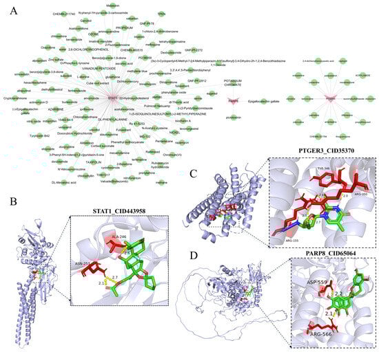 Drug prediction and molecular docking of biomarkers. (A) Drug–gene network of biomarkers. Drugs are colored green, and target proteins are colored pink. (B) Molecular docking between STAT1 and amcinonide. (C) Molecular docking between PTGER3 and zidovudine. (D) Molecular docking between PARP8 and epigallocatechin gallate.