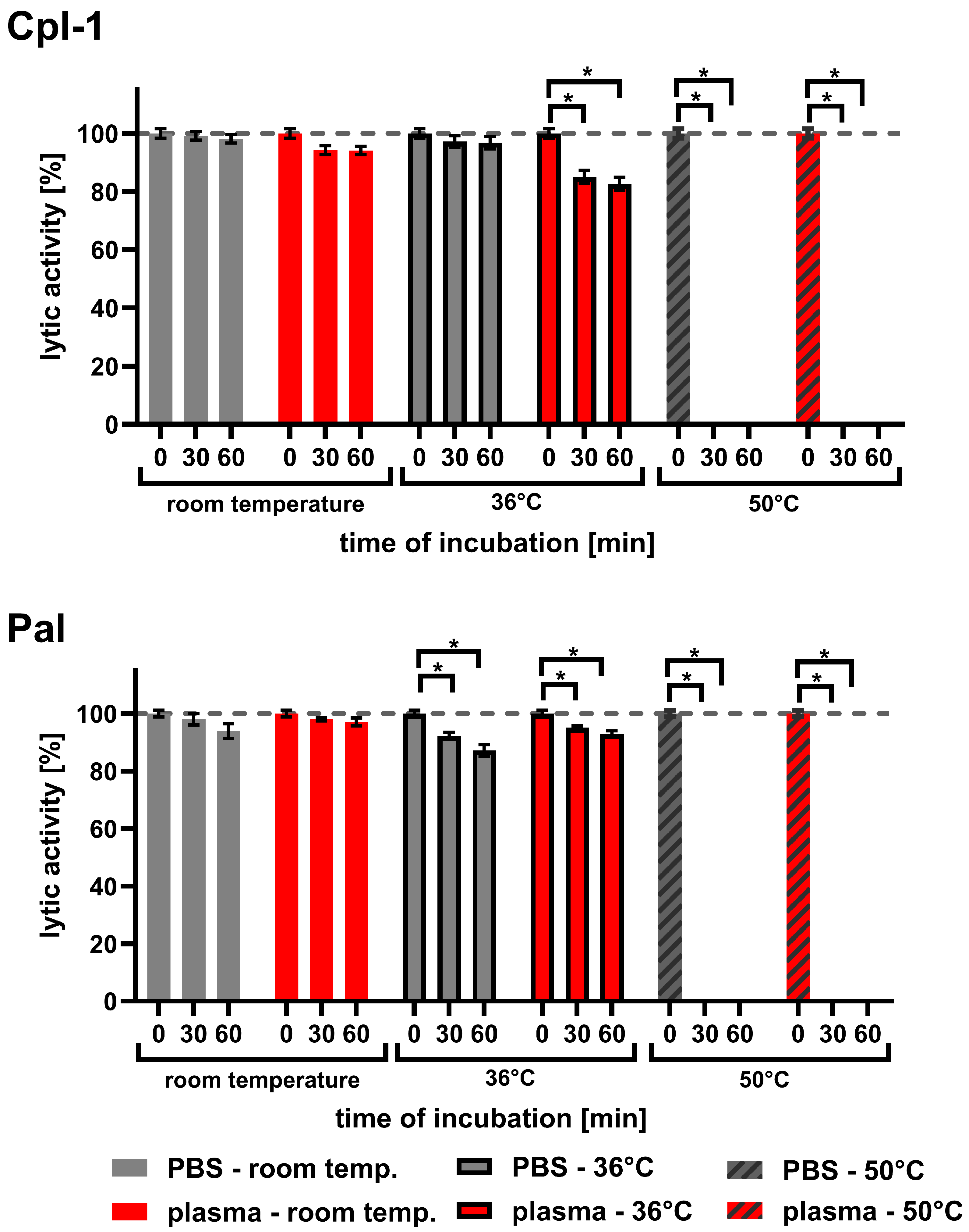 3.6. Body Temperature Has Inhibitory Effect on Cpl-1 and Pal Activity
